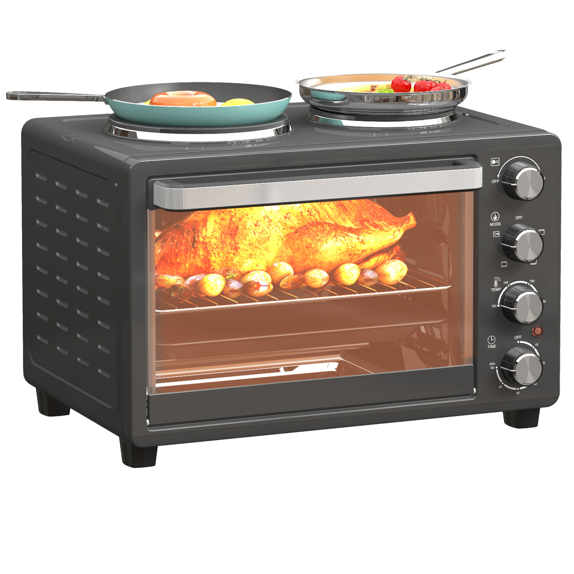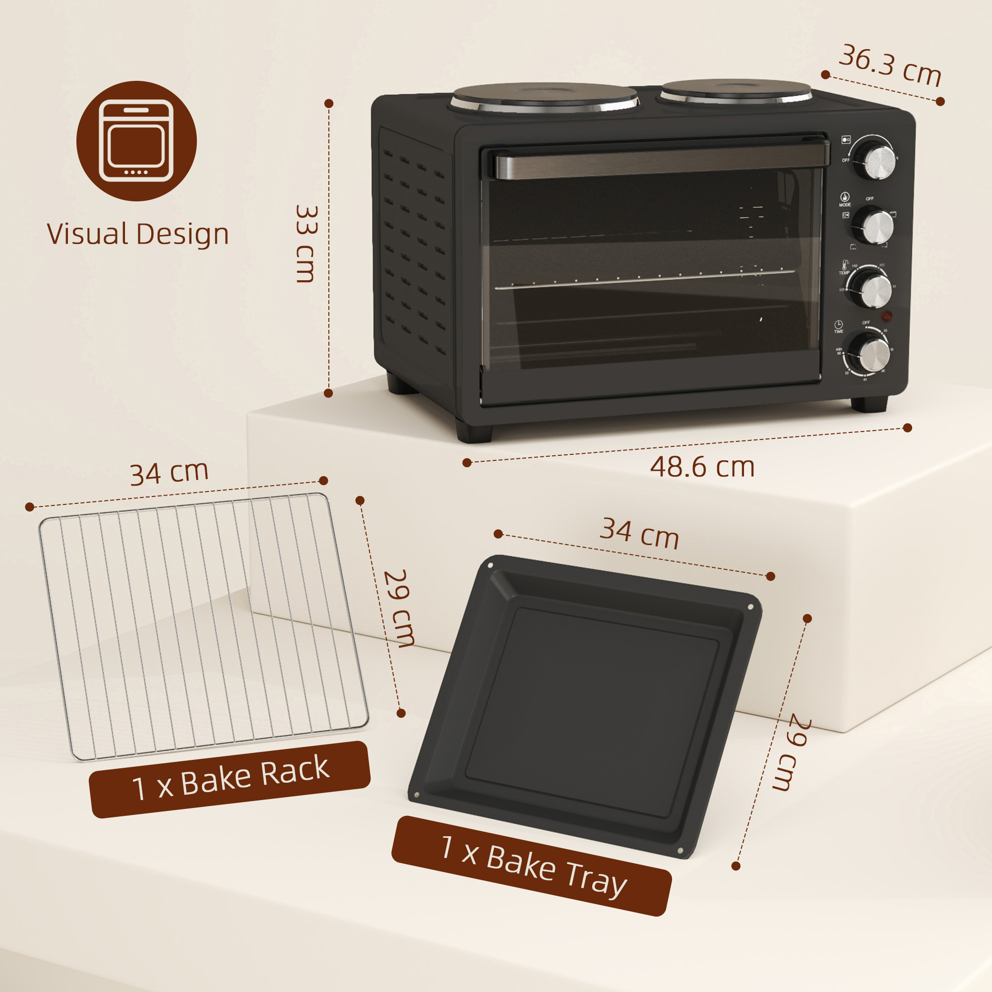 Discover the versatility of the HOMCOM Toaster Oven, a compact culinary powerhouse. With dual hot plates and a 2600W mini oven and grill, you can roast, bake, and grill effortlessly. Fit a 11-inch pizza or a whole chicken in its spacious 28L interior. Featuring adjustable temperatures and a handy timer, this small oven simplifies cooking, making it a brilliant addition to any kitchen.