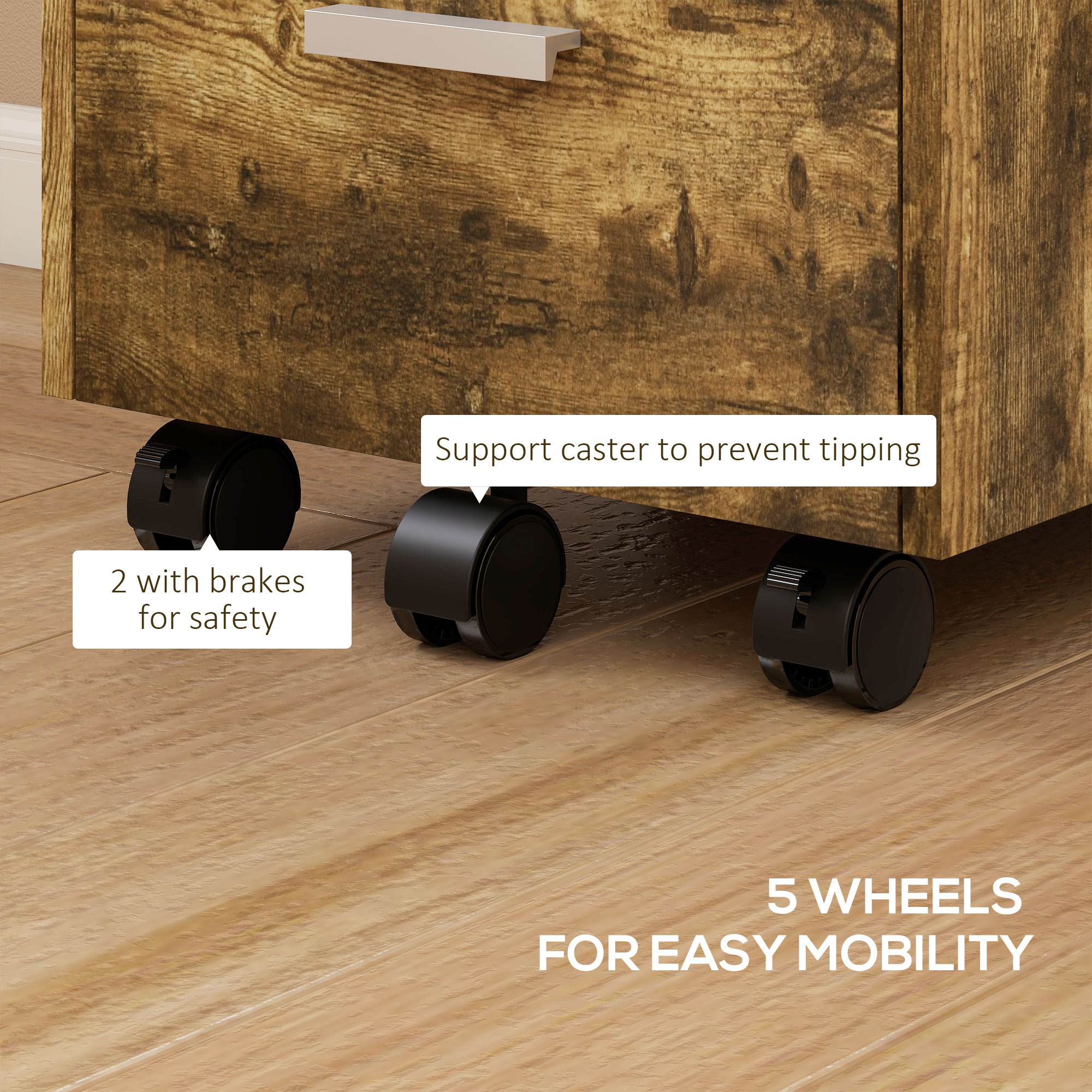 - Five wheels for easy movement, with two brakes and a middle caster for safety