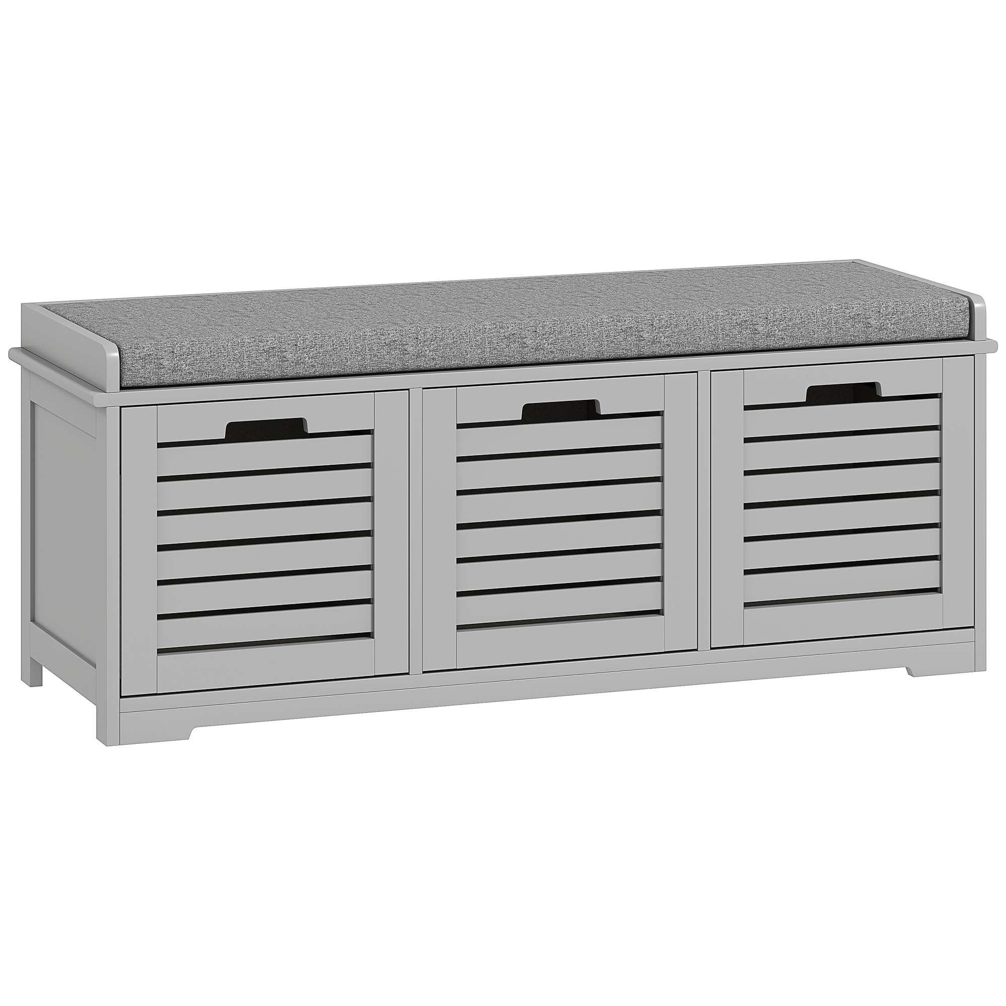 Give your shoes somewhere proud to stand with this storage unit from HOMCOM. Its design is made of three compartments for lots of holding space, with a flat cushioned top so you are able to sit on it. Made from MDF, the frame is tough and reliable for everyday use. Using sponge for the cushion for comfort, it is wrapped in linen so it is smooth and easy to wipe clean. The slatted doors of the compartments allow fresh air to circulate through, with low corner feet elevating the unit to finish.