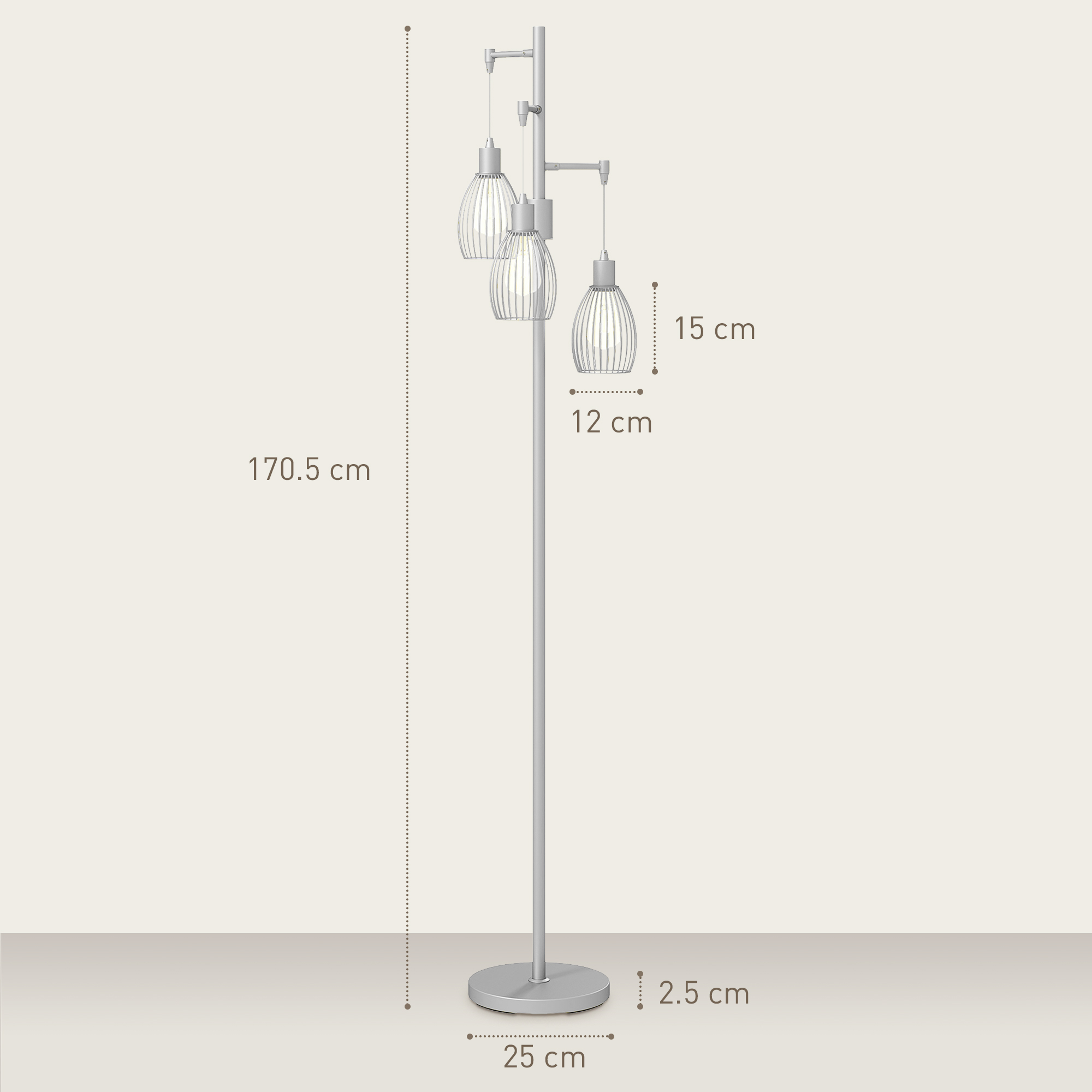 Bring industrial style into your home with this HOMCOM tall lamp. It features three lights for three lots of illumination - they can dim to create your own ambience. The silver tone cage shades create style. It's made from steel, so this industrial floor lamp is strong - with a round base to keep balanced. Transform your space instantly. For screw bulbs - maximum 40W.