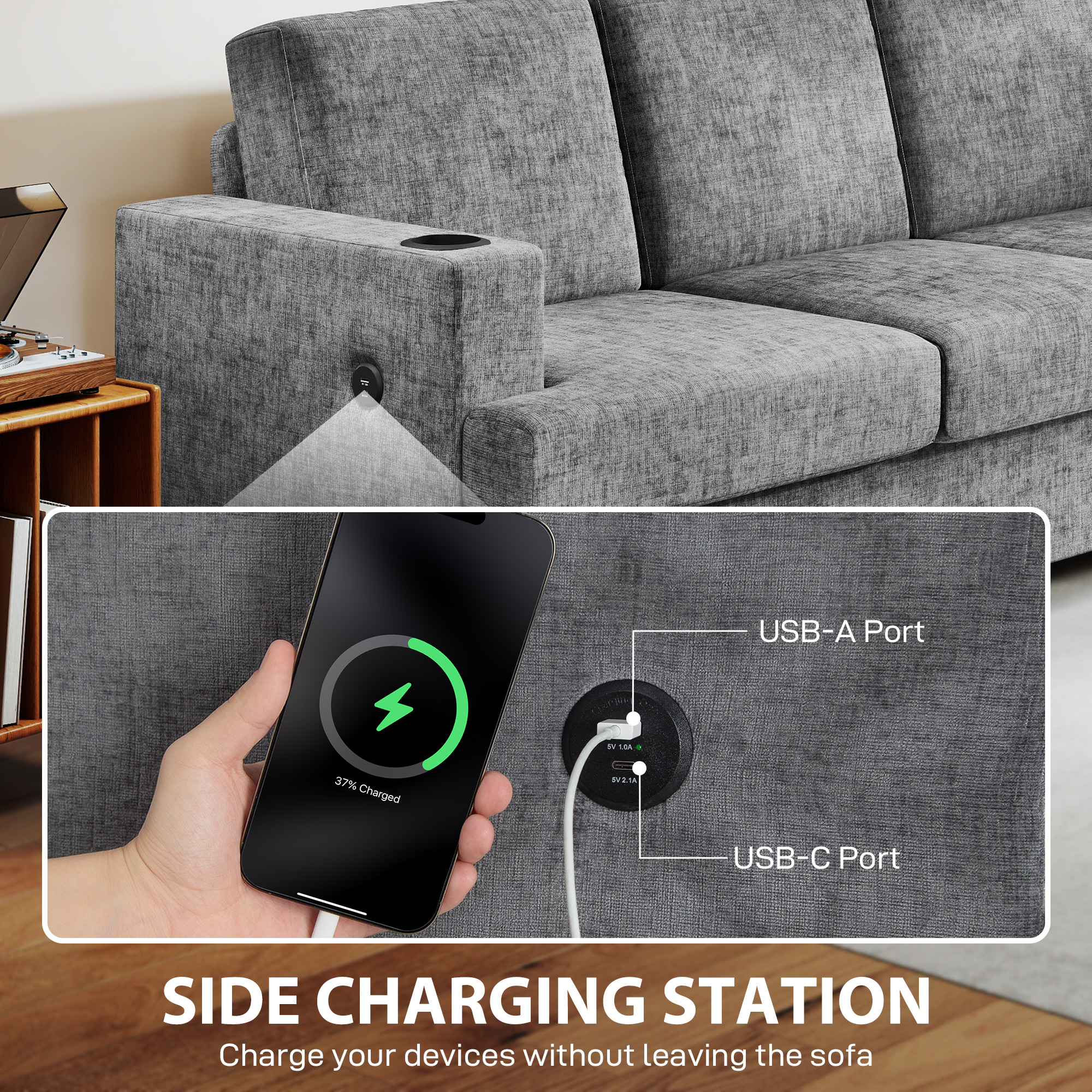 - USB-A and USB-C ports on armrests for convenient charging