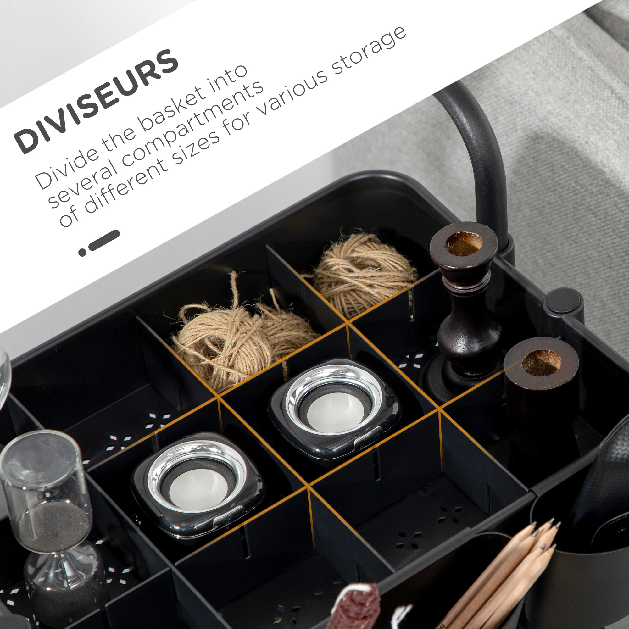 - Three baskets, for plenty of storage. Top basket divided into 12 separate sections