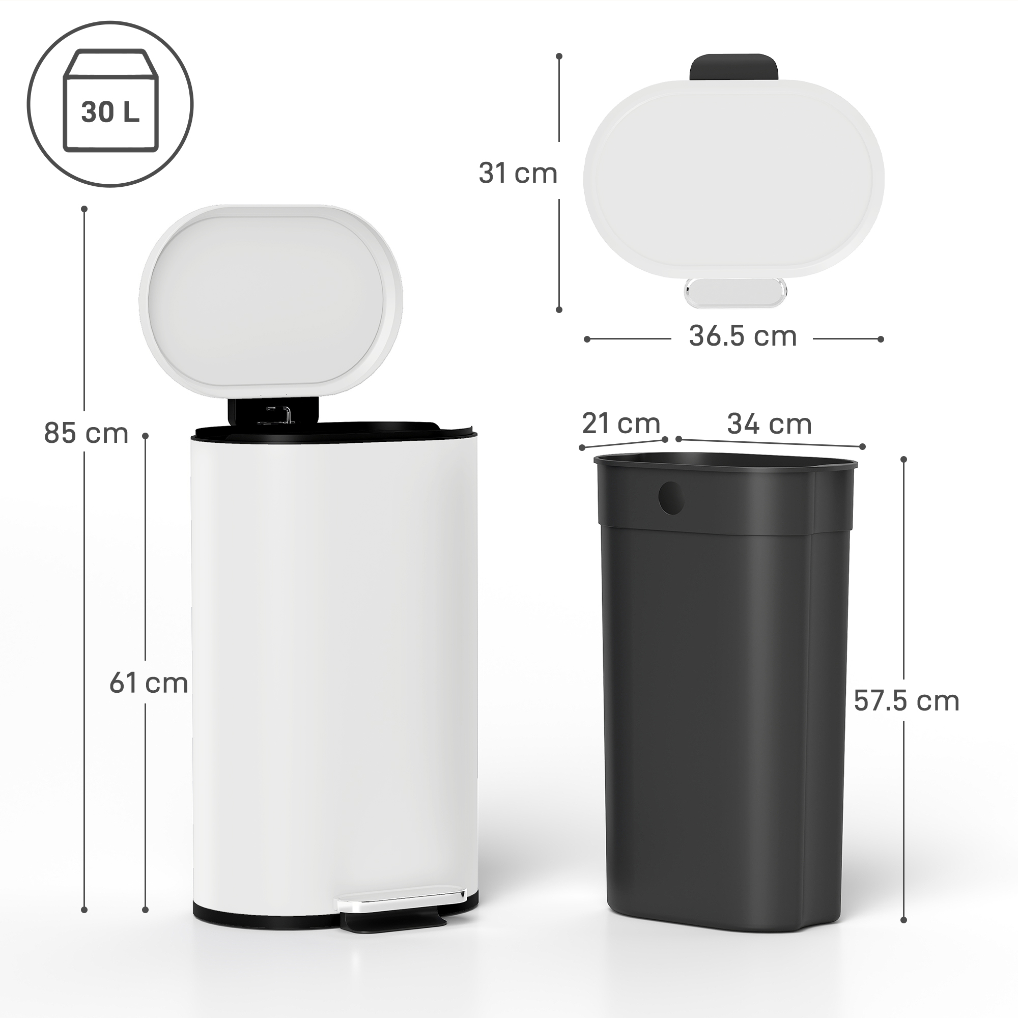 This HOMCOM 30L pedal bin is an essential for every clean and tidy kitchen. It's fitted with a silent soft-close lid so it doesn't bang and distract you; also stays up to a 90° angle for easy filling and bin changing. Made from fingerprint-resistant metal, made into a modern curved shape - a sleek addition to every home.