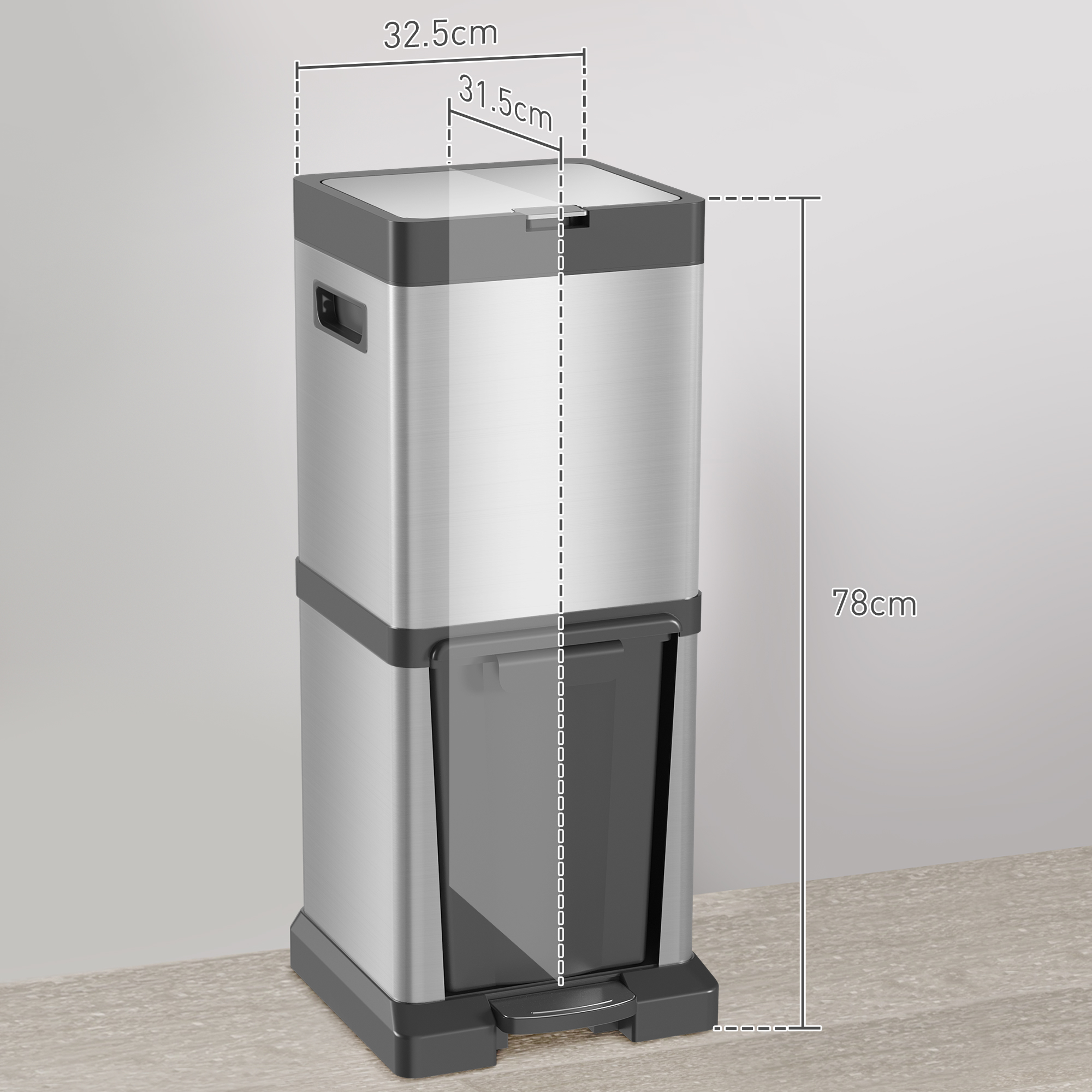 - Double bin with lid: 20L top bin and 14L bottom bin. Great for separating different waste