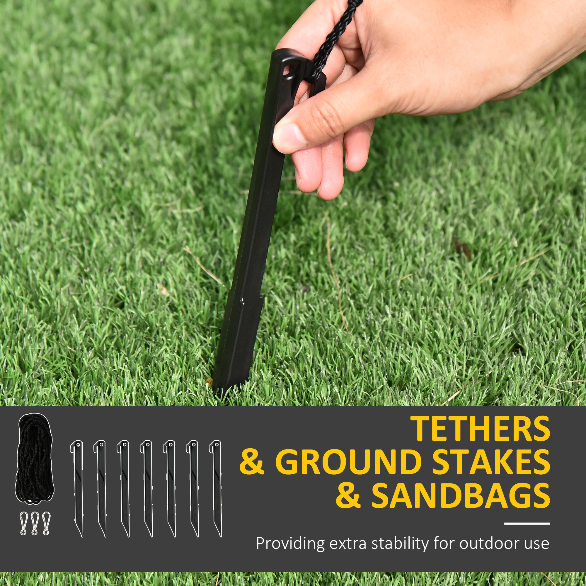 - 7 ground stakes, 3 drawstrings and 4 sandbags ensure the stability and sturdy standing