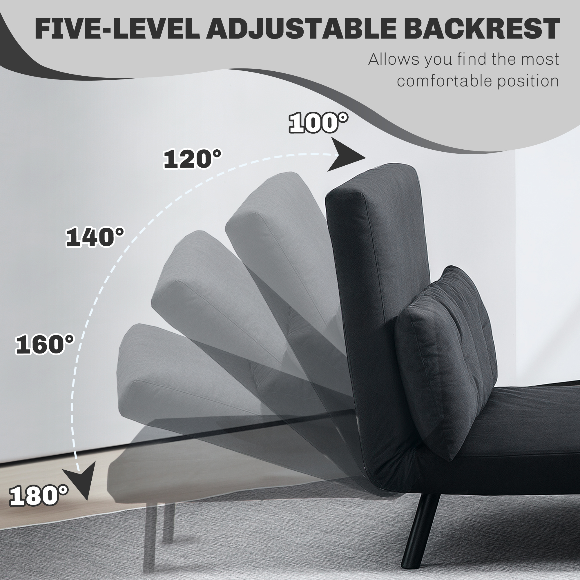 - Five-level adjustable backrest: 100°, 120°, 140°, 160°, 180°