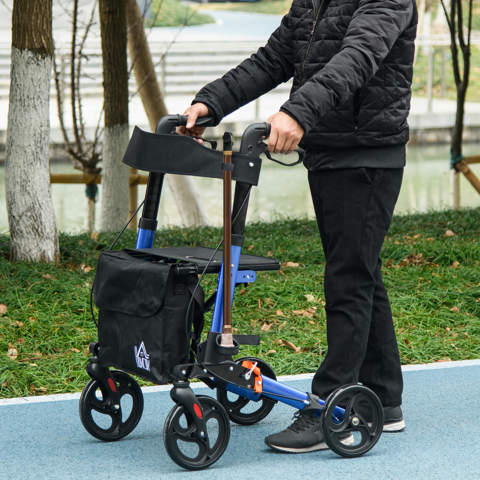 This HOMCOM lightweight rollator walker rolls with you, making journeys stress free. A powder coated aluminium frame for a strong, yet lightweight core, it is fitted with a seat so you can take a break whenever you want. It can be folded into a smaller size for convenient storage and transport. A storage bag to take small essentials with you on the journey. Four wheels for smooth movement, this mobility walker is complete with a dual brake for safety.