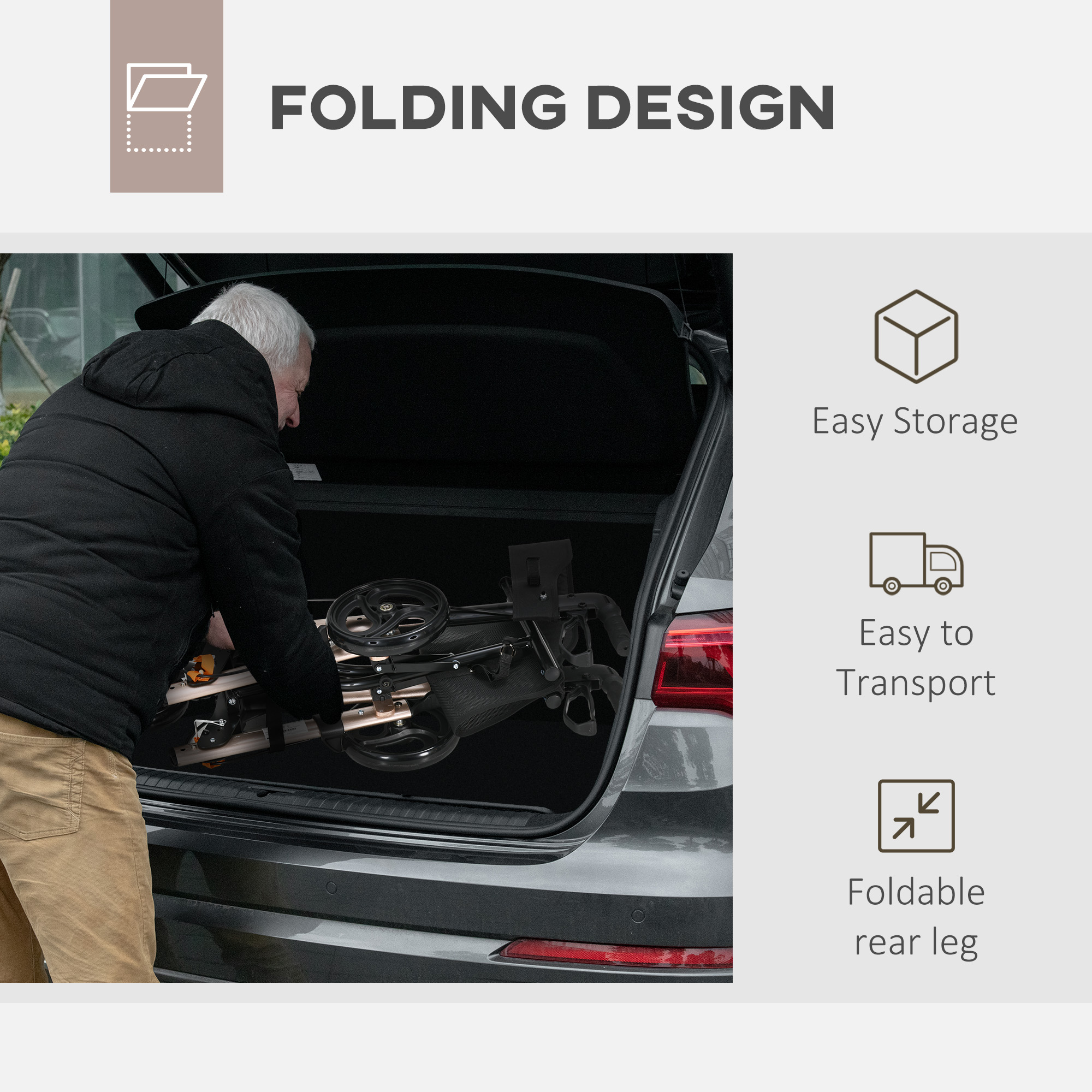- The rear legs of the rollator walker are foldable