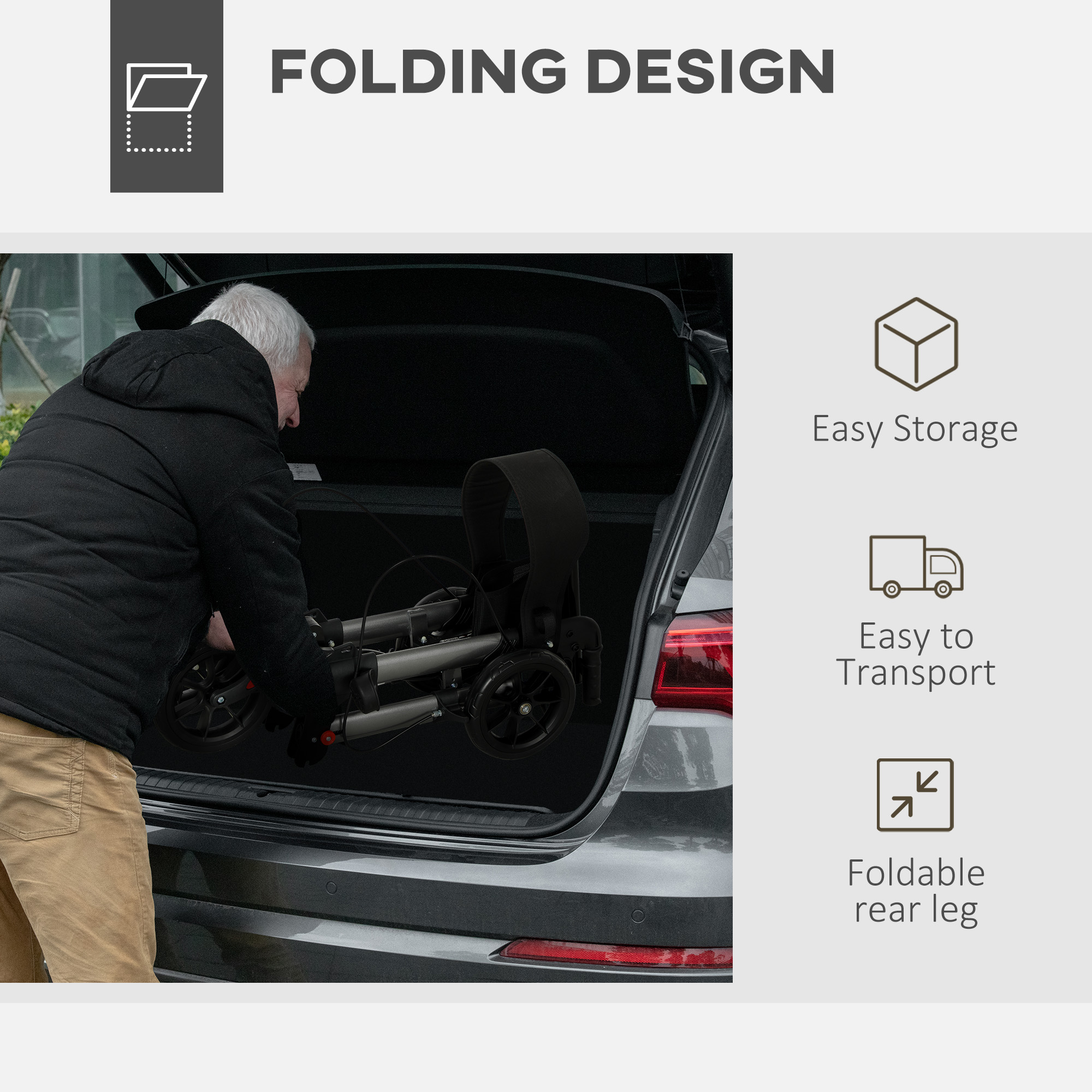 - The rear legs of the rollator walker are foldable