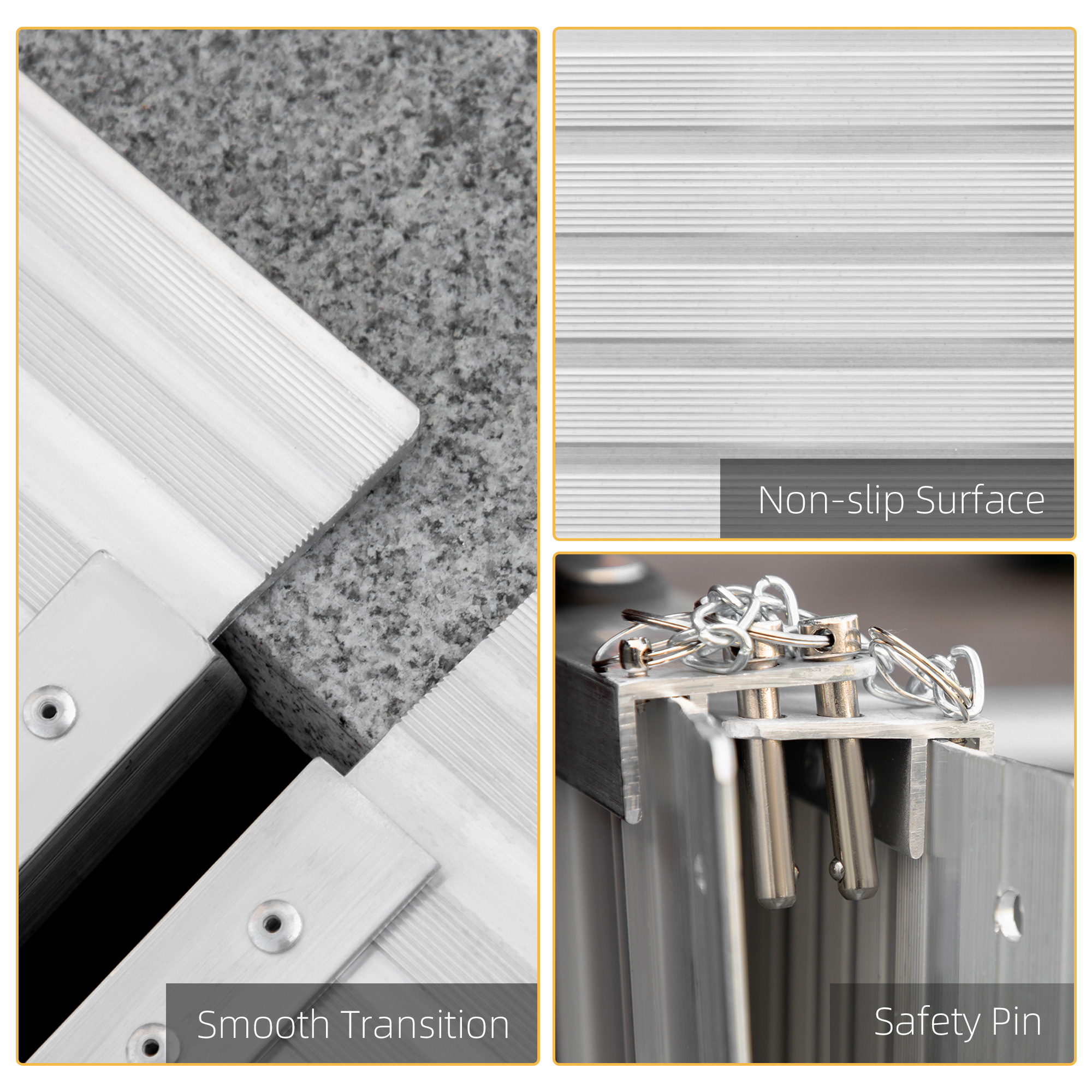 Get easier access to raised surfaces with this door ramp from HOMCOM. Covered with skidproof surface to prevent slipping, making it ideal for any weather condition. When not in use, the aluminium ramp can be easily folded, saving space and enabling storage in the vehicle or at home. The durable aluminium frame is anti-corrosive to last for years of usage. This ramp can be used with wheelchairs, lawn mowers, scooters or any other heavy item that may have trouble with stairs.