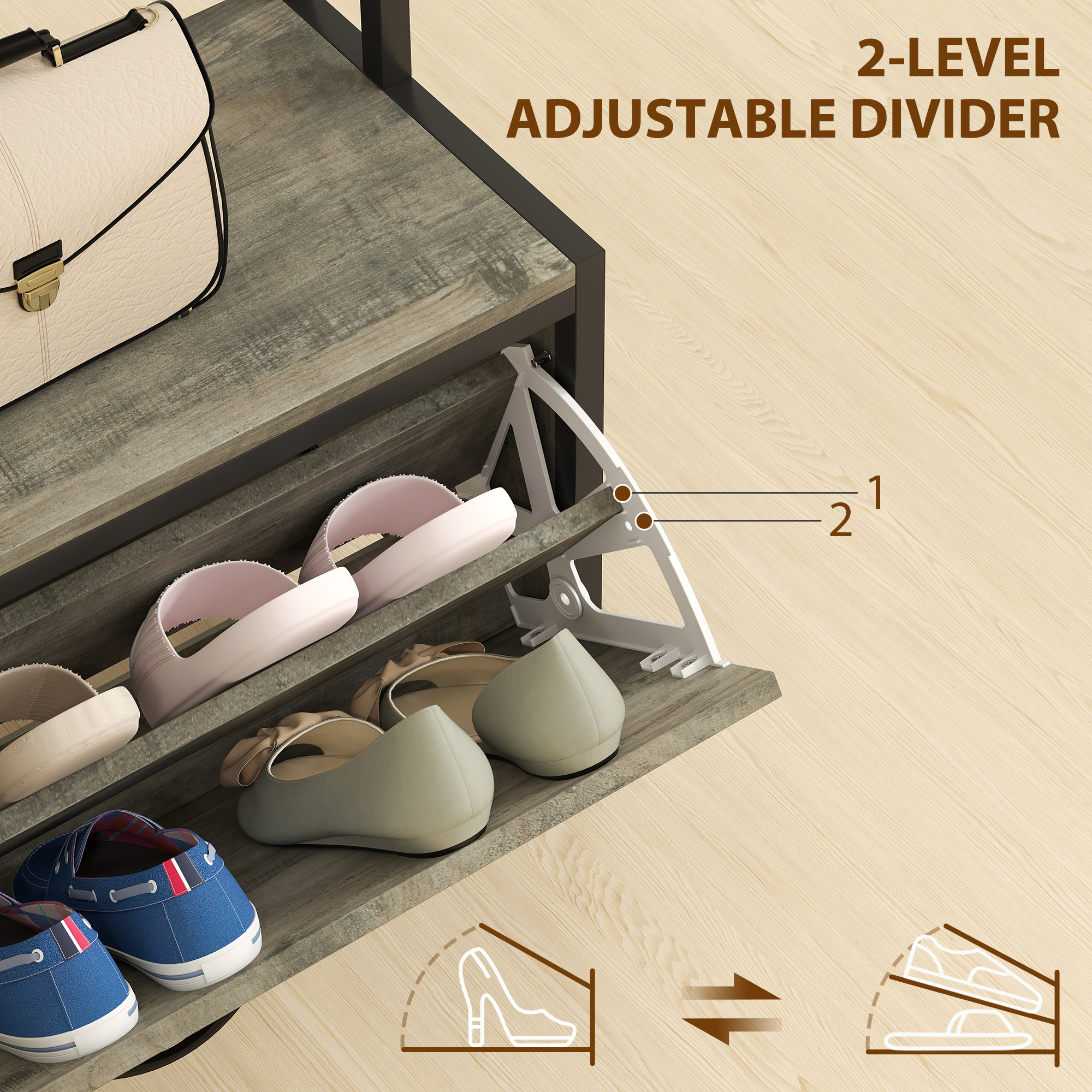 - Shoe cupboard with a two-level adjustable divider to fit in larger footwear