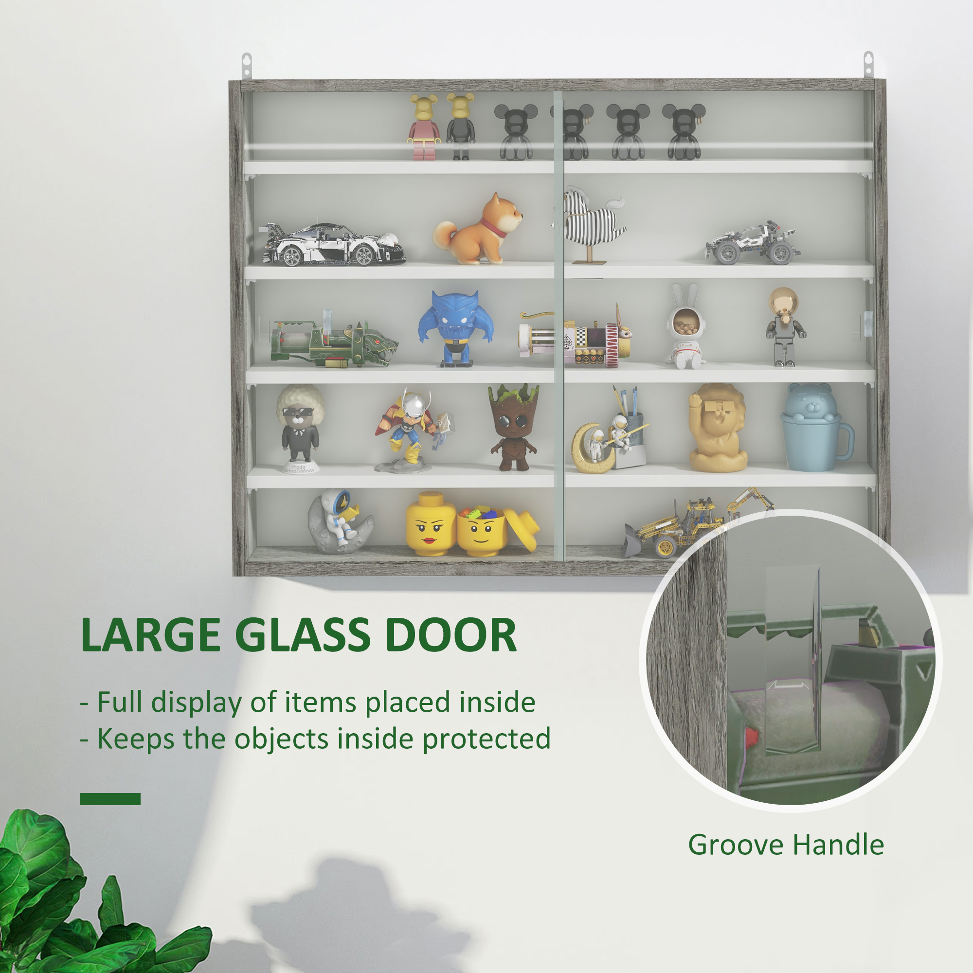 Display and organise favourite decorations with this HOMCOM wall display cabinet. It has four adjustable shelves, with 7 different positions, offering lots of space for smaller and larger items. Made from particle board, the structure is sturdy, and fitted with two sliding glass doors, keeping everything protected and allowing easy access. Easy to fix onto walls, this classic home furnishing will keep all your favourite pieces beautifully displayed.