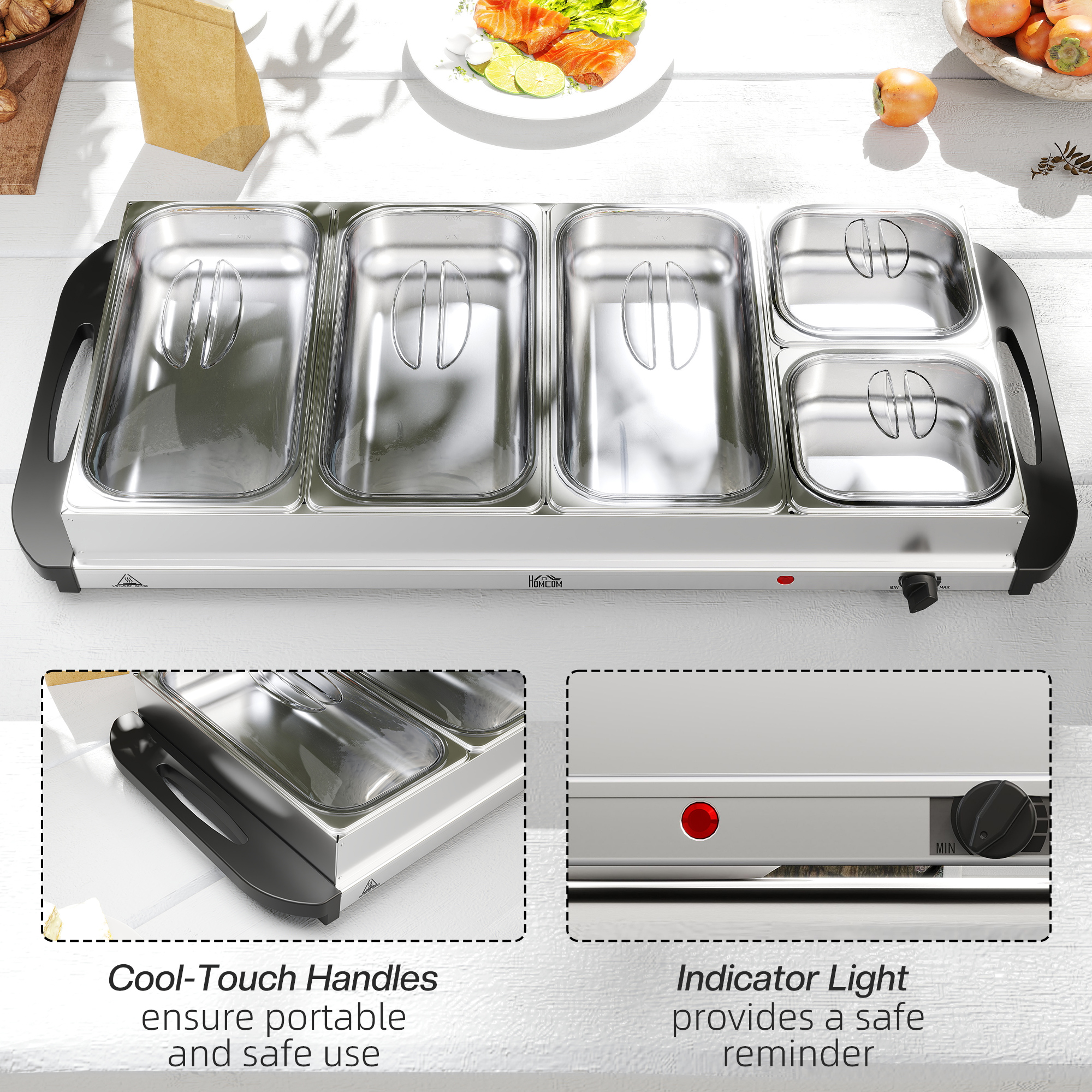 Taking party food to the next level, this HOMCOM electric buffet warming tray gives guests delicious warm food, all event long. Made from stainless steel, this a strong piece which retains the heat superbly. The 58°C-85°C adjustable temperature allows you to set to a heat you want - great for different food. Comes with 2x 1L trays and 3x 2.4L trays: five areas for different foods, all with a clear lid to keep food covered and the heat retained. Finished with cool-touch handles.