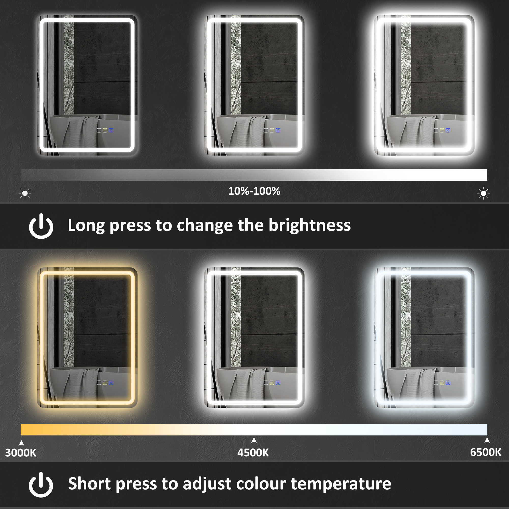 - LED lights change between three colours. 10-100% adjustable brightness. Set mirror to how you need