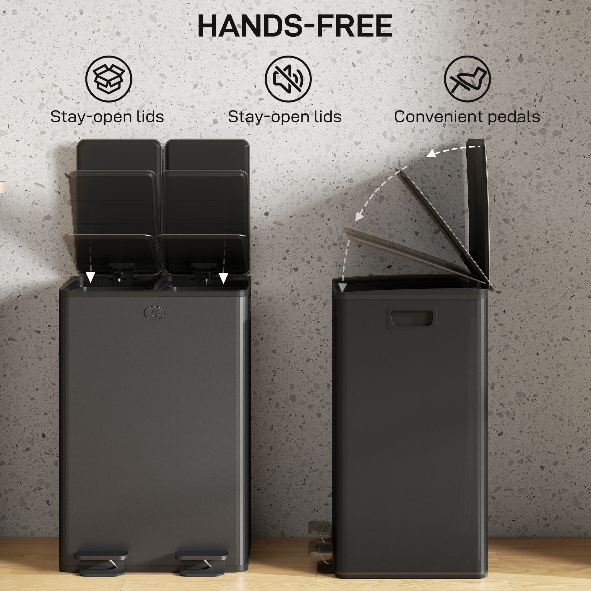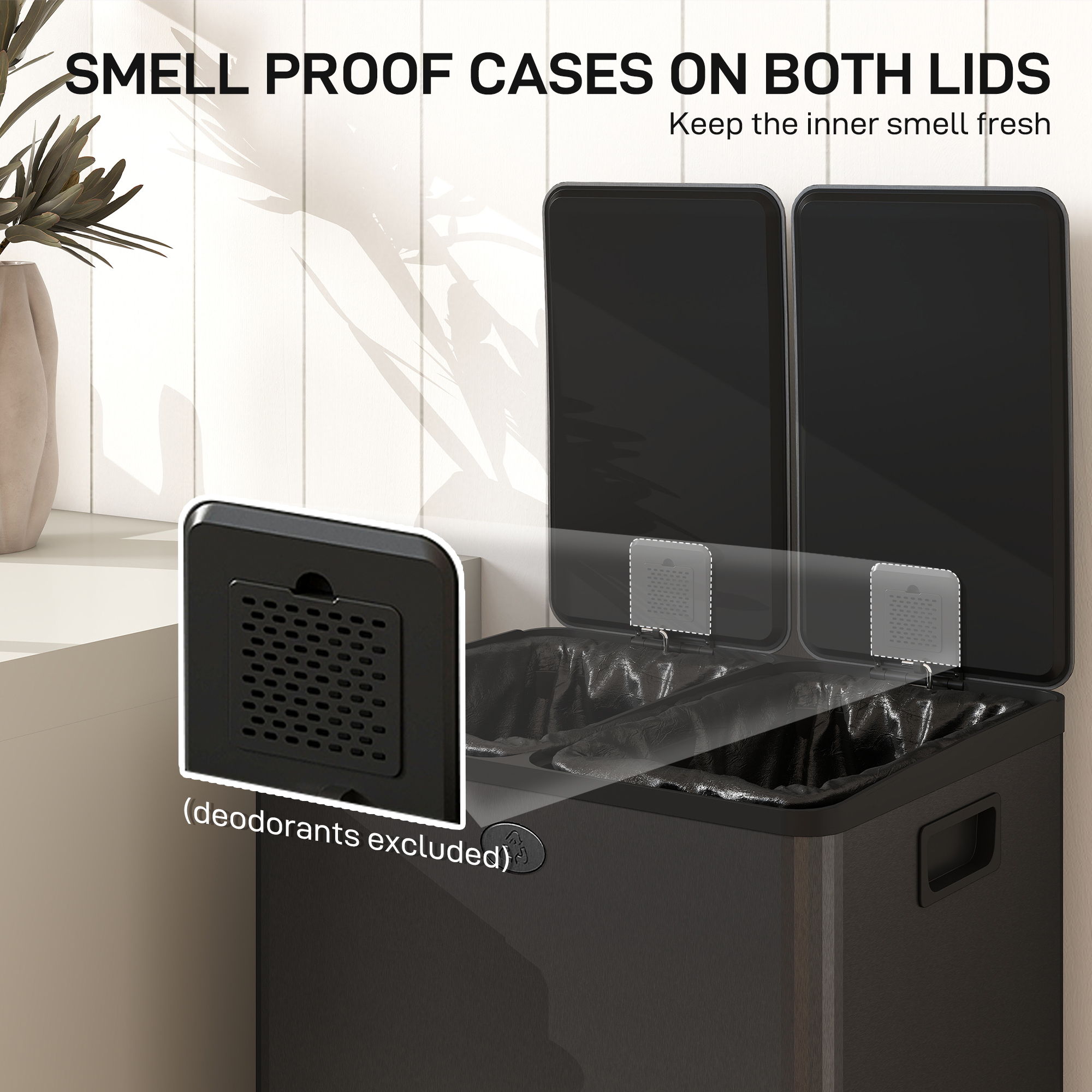 Double the compact hygiene, for the kitchen and beyond: this HOMCOM 28L double kitchen pedal bin. Made from stainless steel, this is a piece suited for everyday use; the two-compartment design allows you to separate waste as needed. Place deodorisers in the lid slots to keep the smell fresh, with a stay-open option for super easy cleaning. So, when you feel stuck on space, go for this small but mighty dual rubbish bin.