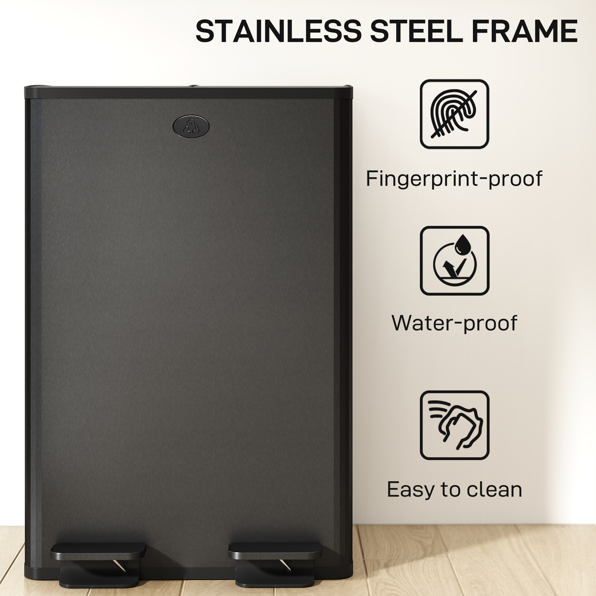 - Stainless steel structure makes double bin robust. Sleek polished finish. Resists fingerprint marks for hygiene