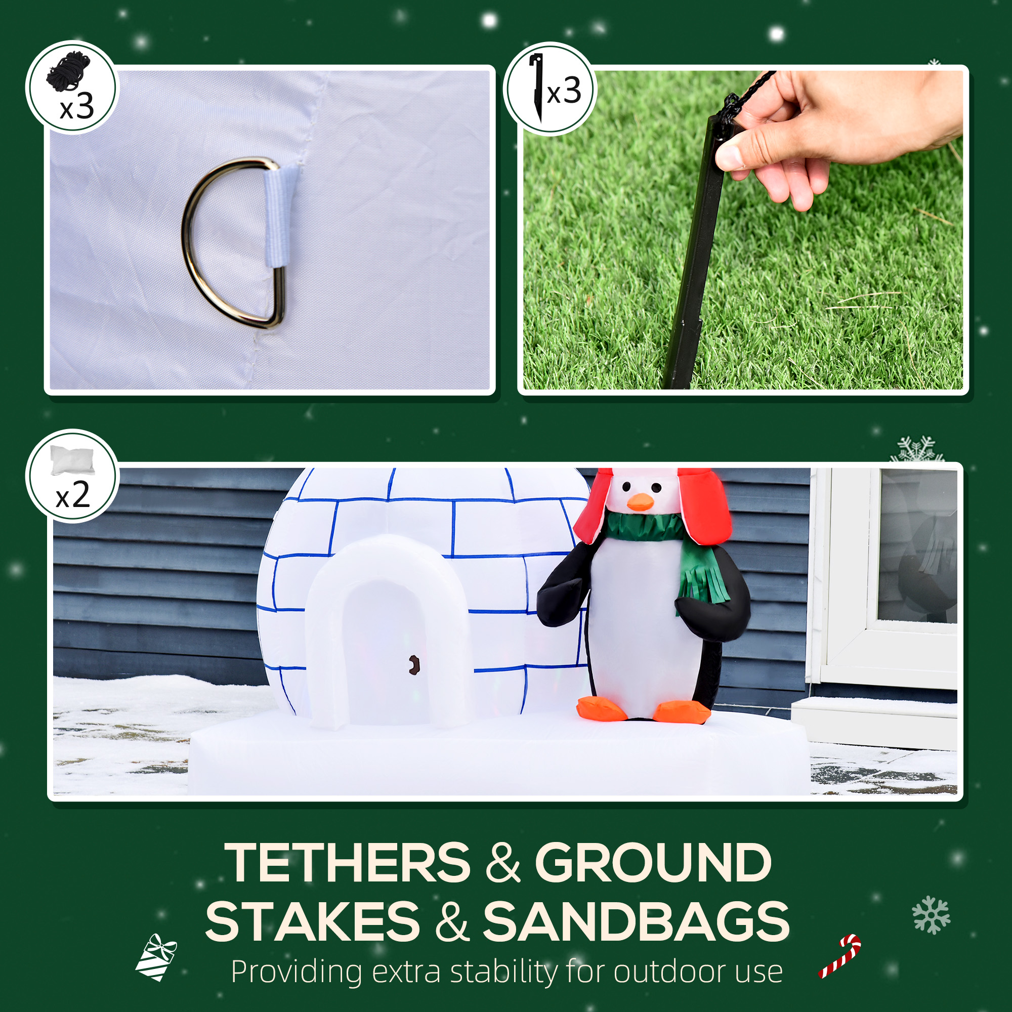 Add some magic to your Christmas decorations this season. Bring this HOMCOM inflatable decoration into the home. Made from thick polyester, the shell is durable for repeated use. It's also IP44 rated so secure against light/mild water splashes - can be used outdoors. A cute design of two penguins around an igloo, inner LED lights create a cute and soft glow. Comes with accessories to keep it stabilised to the ground.