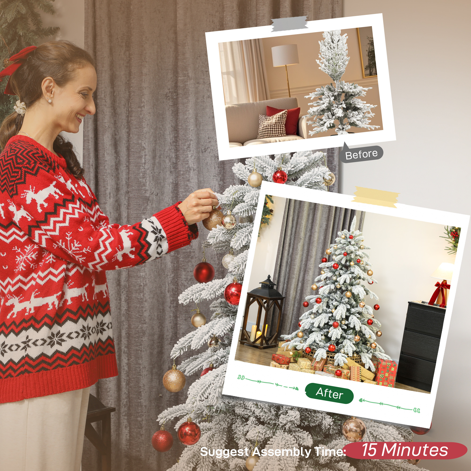 This Christmas, create a serene winter wonderland - in your own home, with this HOMCOM artificial Christmas tree. Sporting lush green branches in faux snow flocking, this is a wide and voluptuous piece: suitable for the season. The pre-attached hinges mean all you have to do is shape the tree quickly - frees up your time for family. The fire-resistant design offers peace of mind in the home (just don't expose close contact to naked flames!). Complete with a folding metal base.