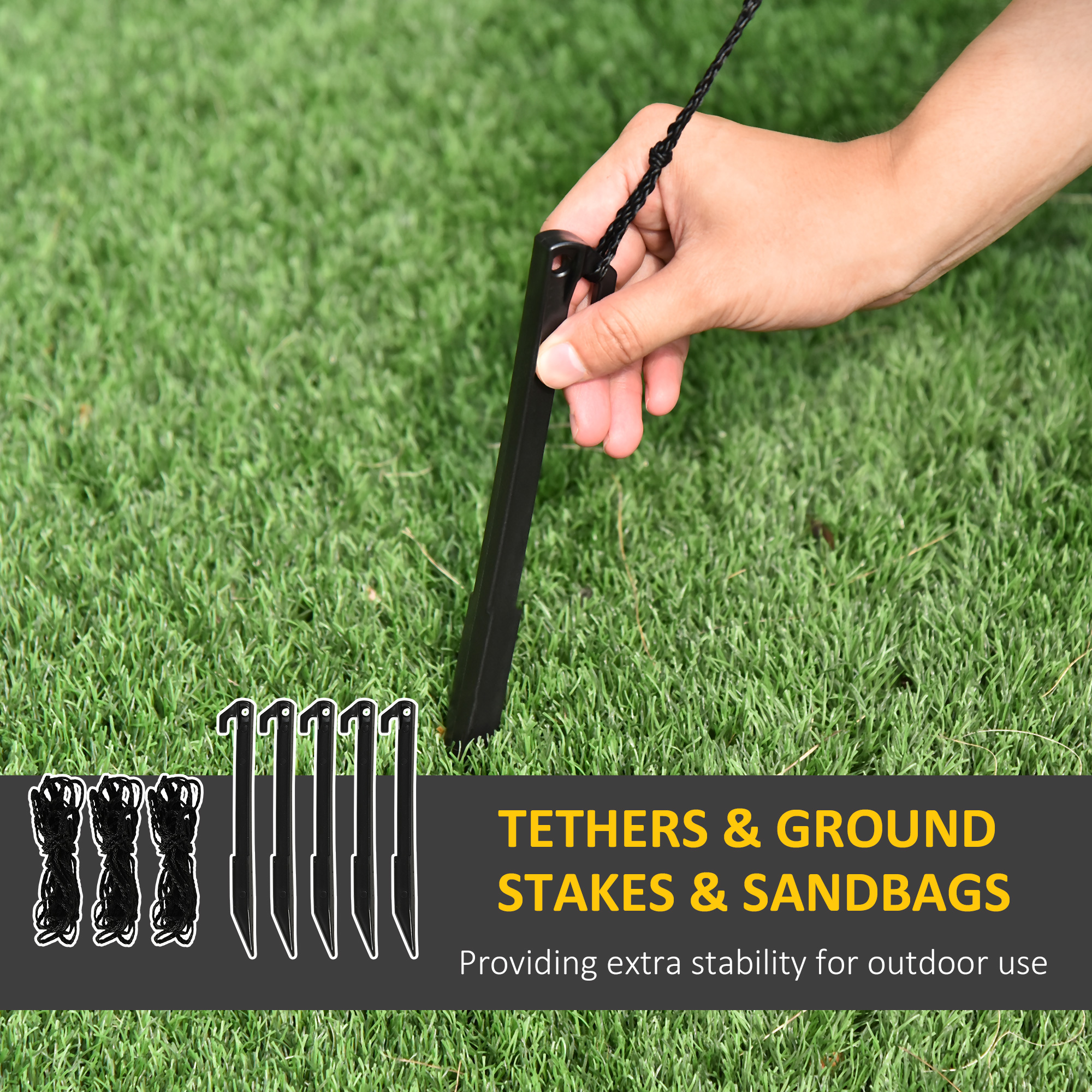 - Lawn stakes and tether ropes provide strong stability