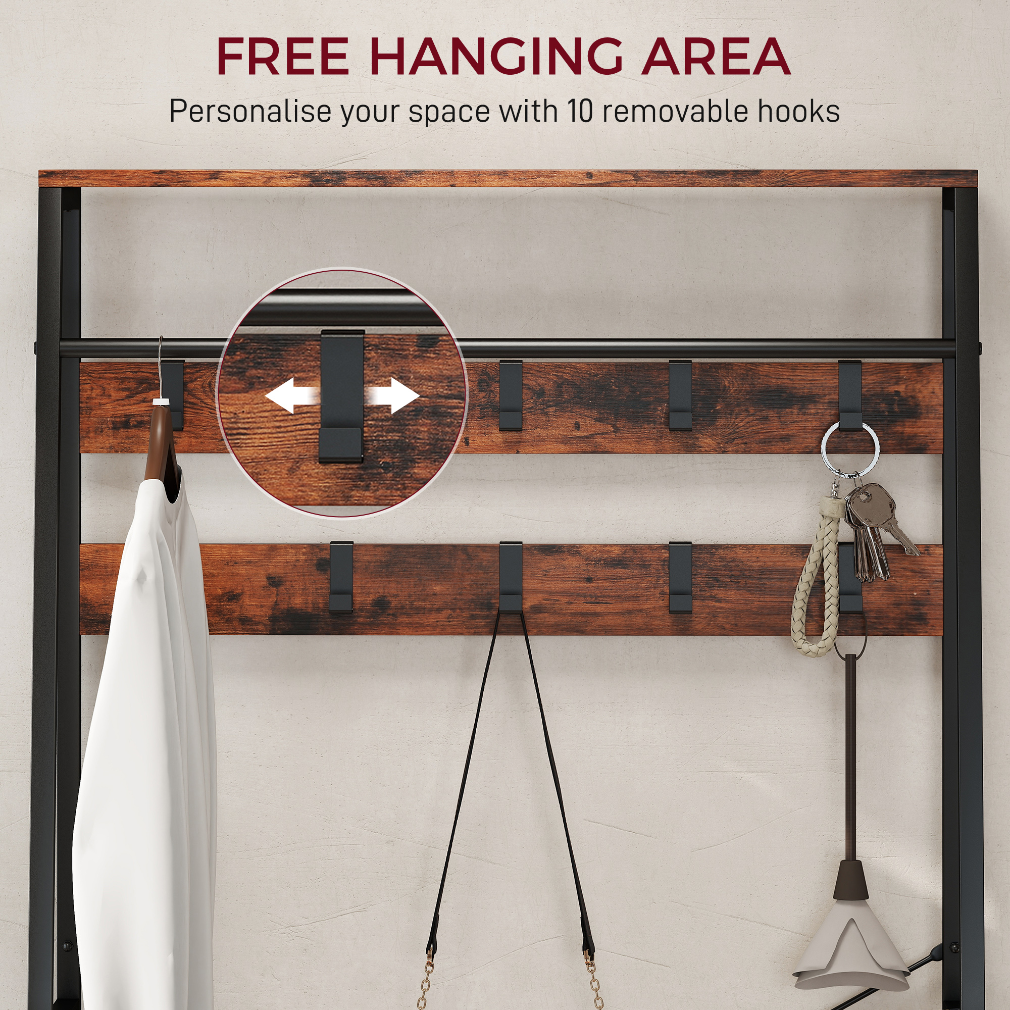 Tired of morning entryway chaos? The frantic search for coats and shoes can be stressful, especially with a busy family. This HOMCOM hall tree provides a calm solution. Its solid frame offers peace of mind, while the integrated coat rack and shoe storage create a dedicated spot for everything. With ten removable hooks for customization, you can finally transform that cluttered corner into an organised, welcoming space for a smoother start to your day.