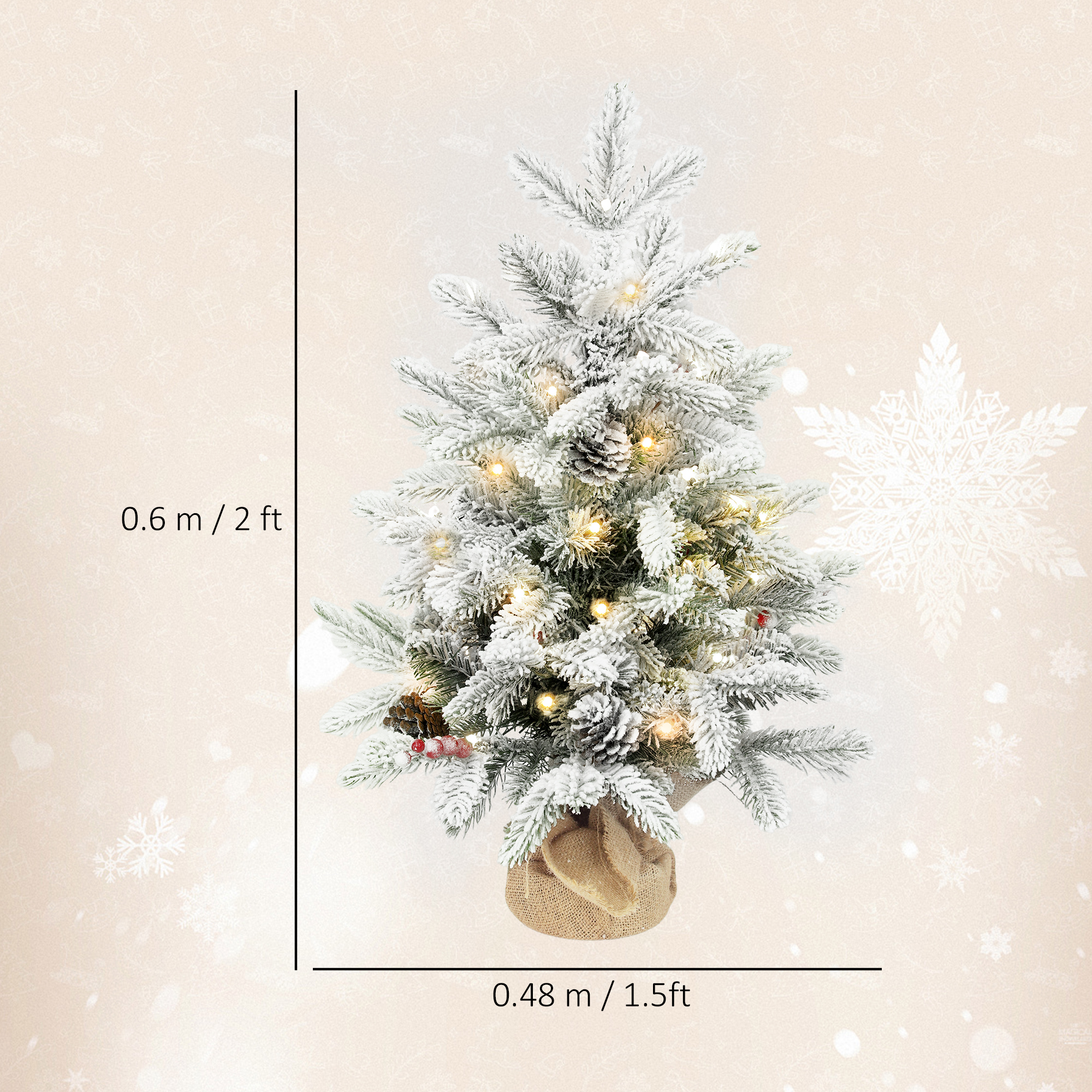 Light up your festive season with the HOMCOM Prelit Tabletop Christmas Tree. Enjoy the warmth of 35 LED lights, no plug required, thanks to battery operation and a handy timer. Delight in its realistic snowy branches, adorned with pine cones and berry clusters, all crafted from flame-retardant materials for your peace of mind. Excellent for adding a touch of winter Christmas charm to any small space.