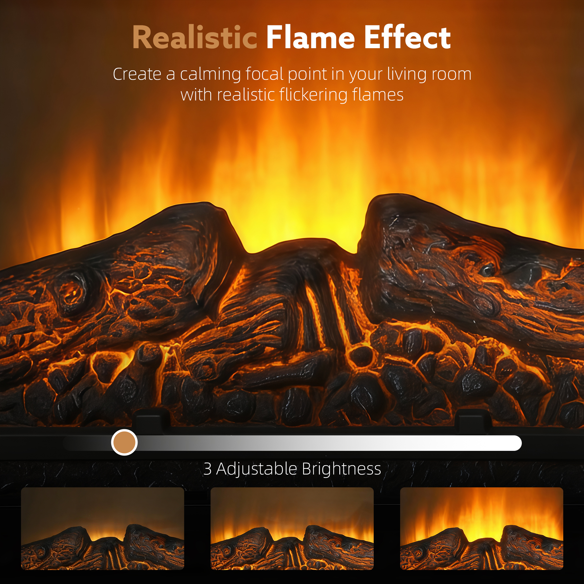 - Faux flames, with three brightness levels. A beautiful look without the danger