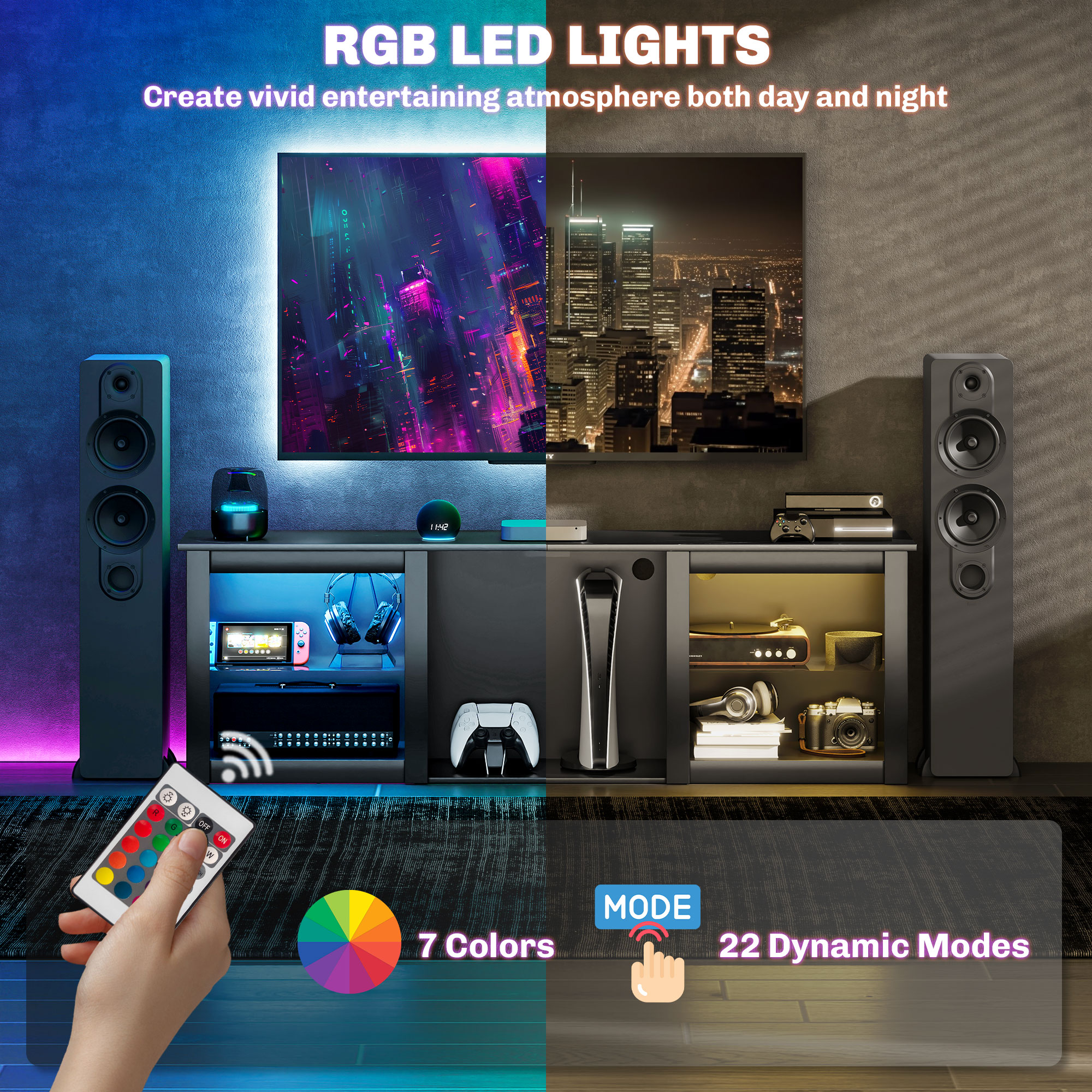 - LED lights, with seven colours and 22 modes. Set the ambiance you want with a remote