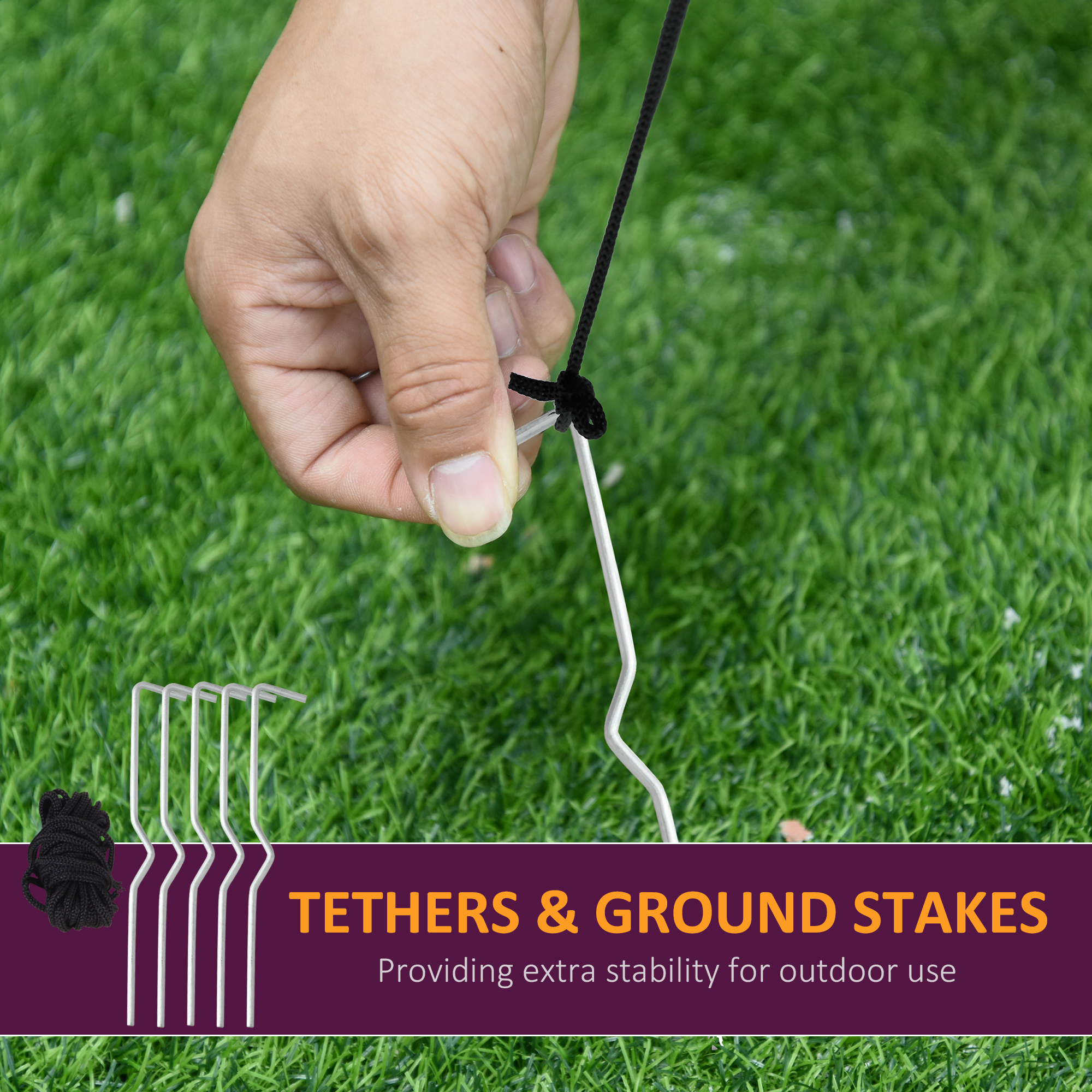 - Internal fan, three tether ropes, five ground stakes and sandbag included