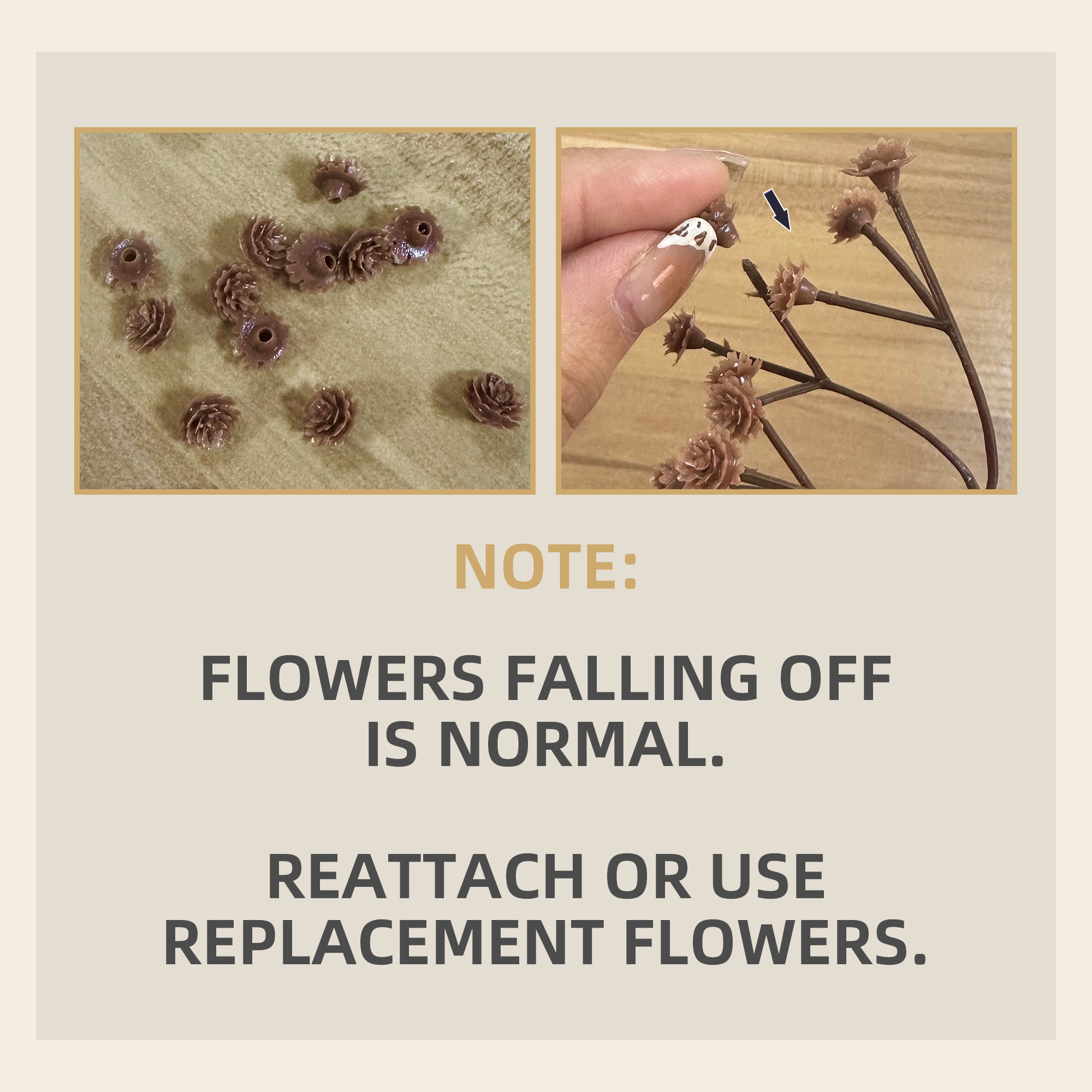 - Note: Flowers falling off is normal. Reattach or use replacement flowers