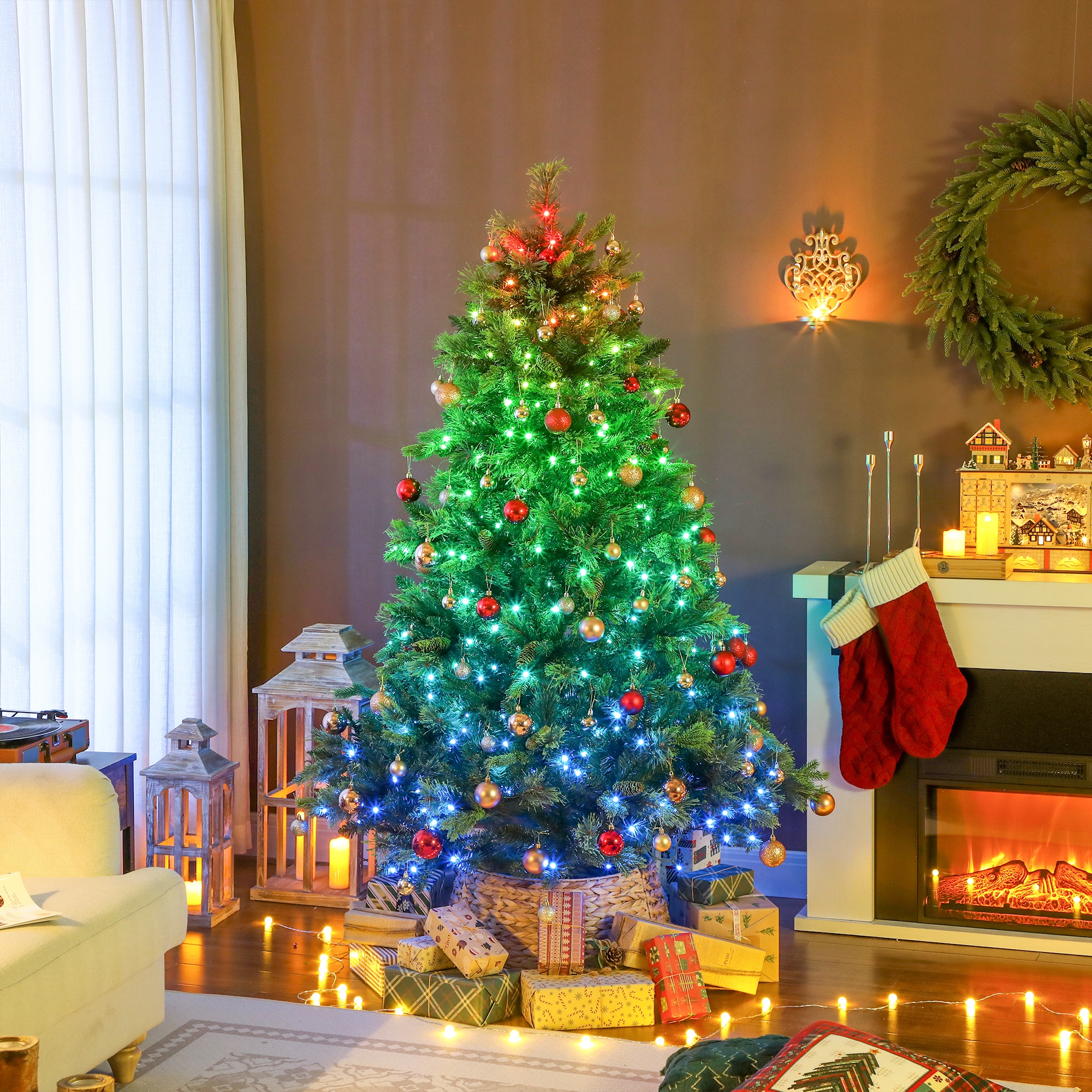 A beautiful sparkling centrepiece for Christmas: take this HOMCOM artificial Christmas tree. Made with leaves and needles, with some mimicking natural branches, and adorned with pine cones - this is a beautiful lifelike piece. It's fitted with multicoloured LEDs: 12 colours, four effects, 12 modes and adjustable brightness and speed, with a timer to set it to glow your way; create the ambience you desire this season. Remote included.