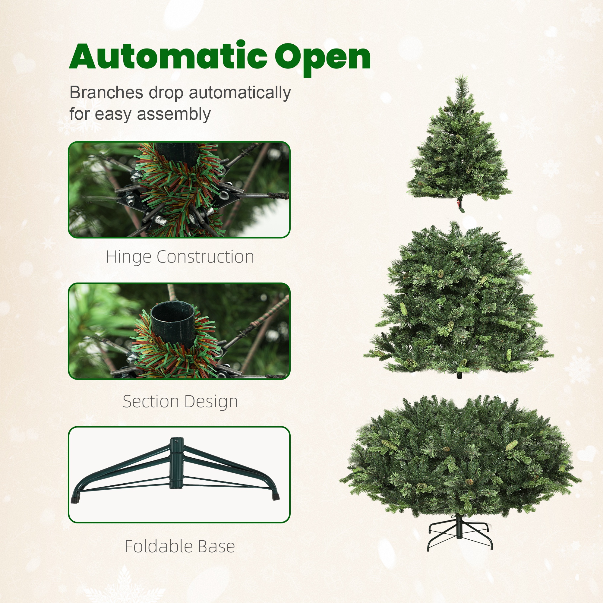 - Hinged branches to drop automatically into place, making setup quick and effortless