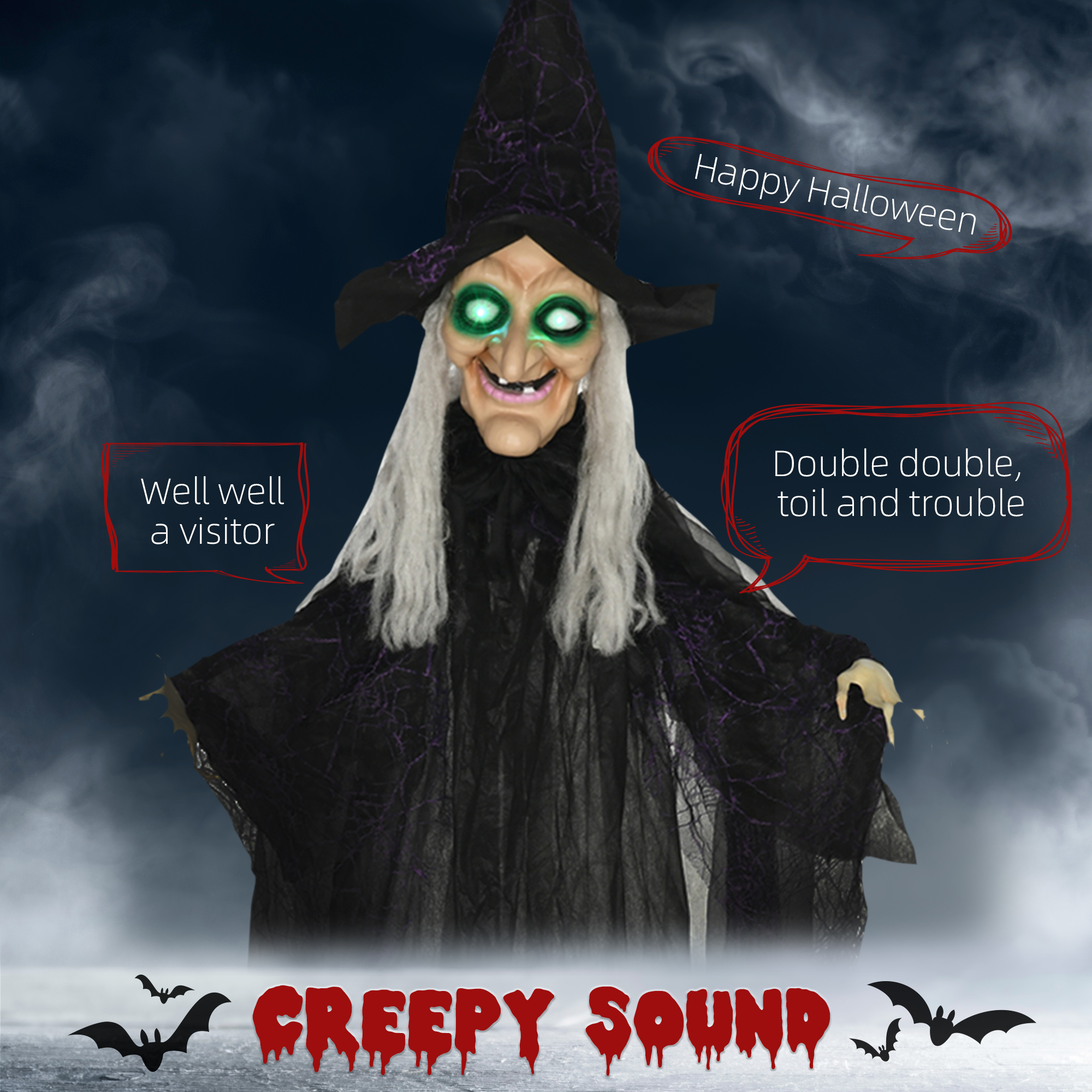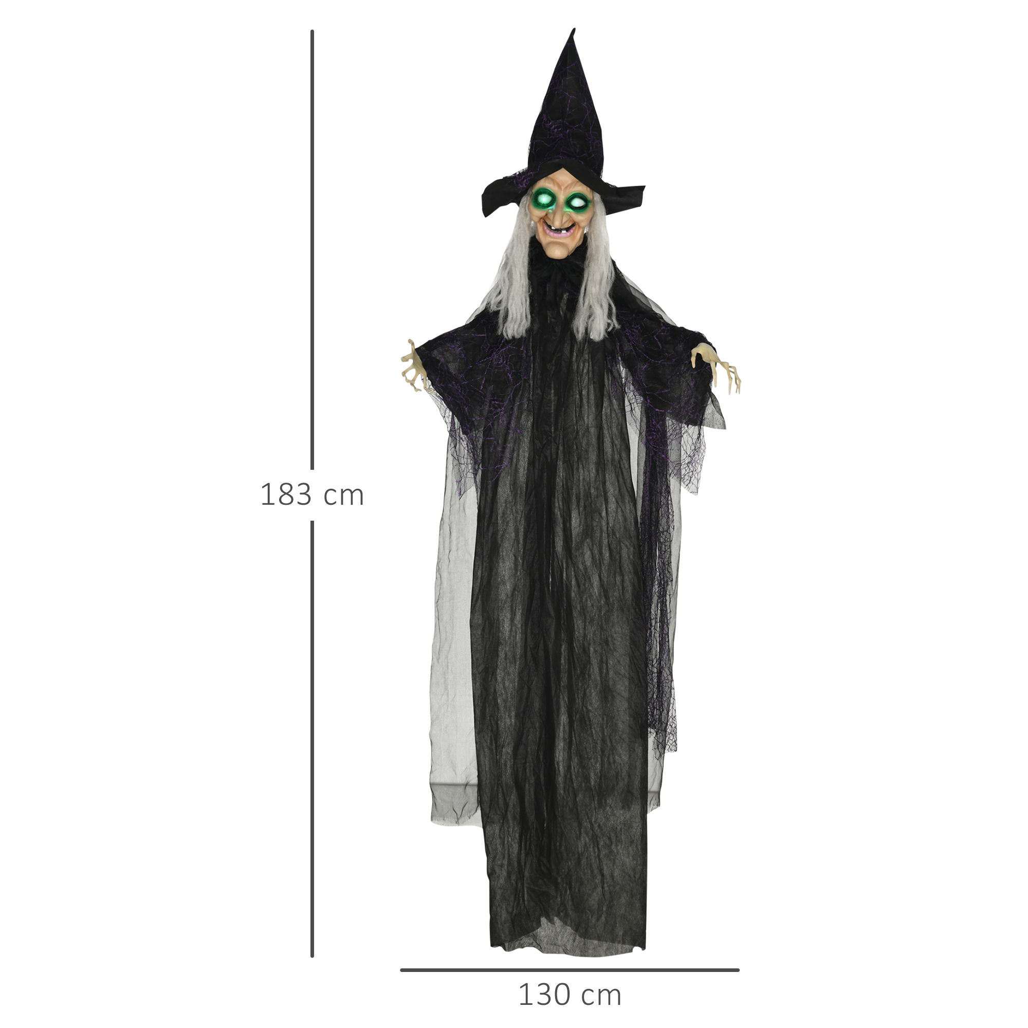 The scary outdoor Halloween decor would like to have some fun. When trick-or-treaters approach, she will sense them and the fun starts! Her eyes will blink a wicked light and make creepy sounds. Desperate for entertainment, she talks to terrify them. If you get our HOMCOM Halloween witch decoration, trick-or-treaters will think twice about taking too many candies from your candy bowl.