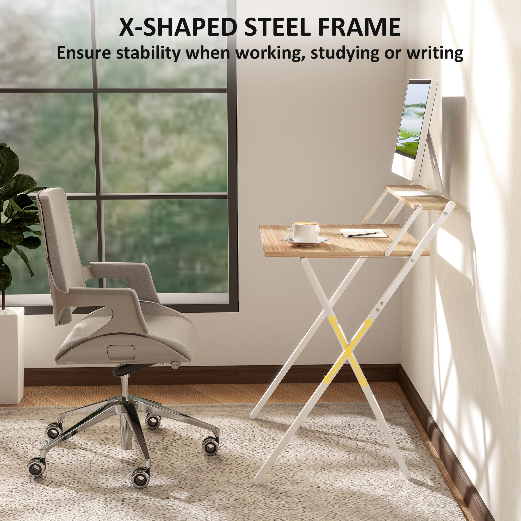 Meet your new workspace superhero—the small computer desk from HOMCOM, a true space-saver for your home office or study area. This compact study desk transformes any nook into a practical workspace. When you're done conquering your to-do list, simply fold it away—out of sight, but never out of style. The top shelf doubles as a handy monitor stand or storage space while the sleek X-shaped frame ensures stability. Unfold productivity, fold away the mess—upgrade your workspace today.