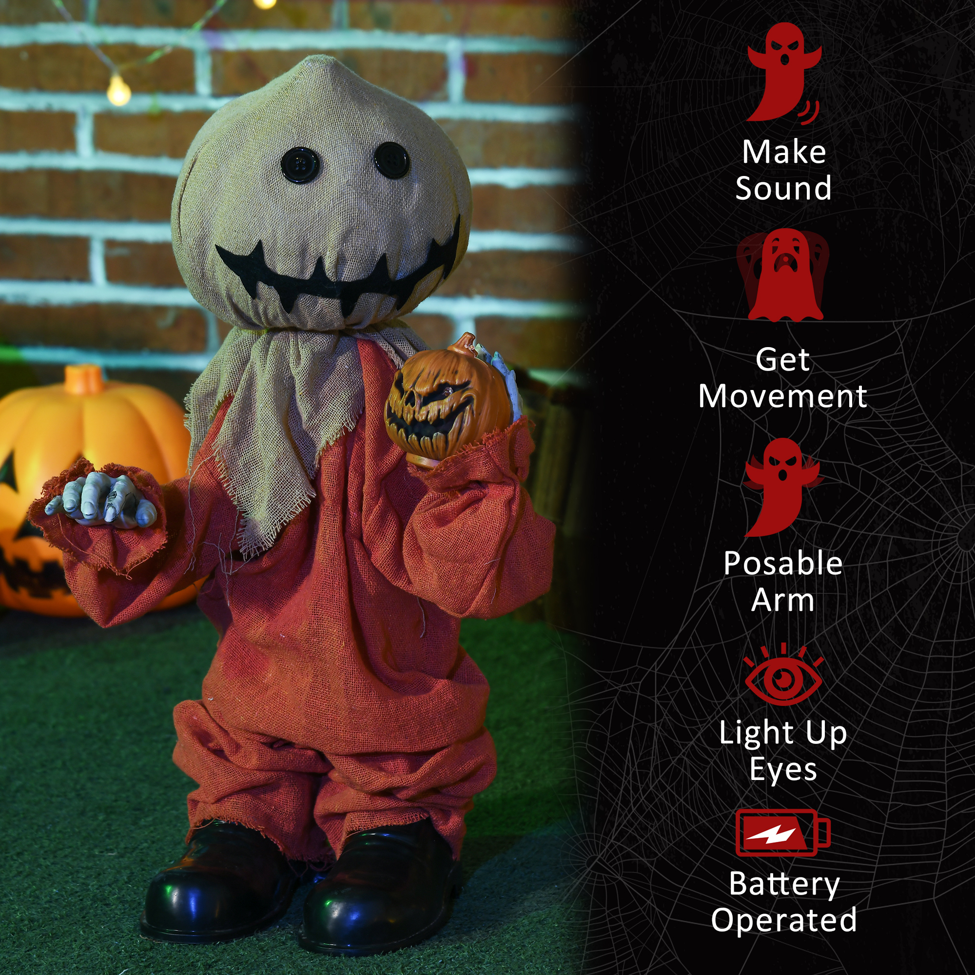 A haunting halloween, in real motion. This HOMCOM scarecrow decoration not only comes in a scary design, but it moves and shakes for extra fun and realness. To get it going, simply touch it or make a loud noise: it will start making a creepy laugh and howl; the lights will also glow ready. Arms are also bendable. Perfect for scaring people! Battery powered, requires 3 x AA batteries (not included).