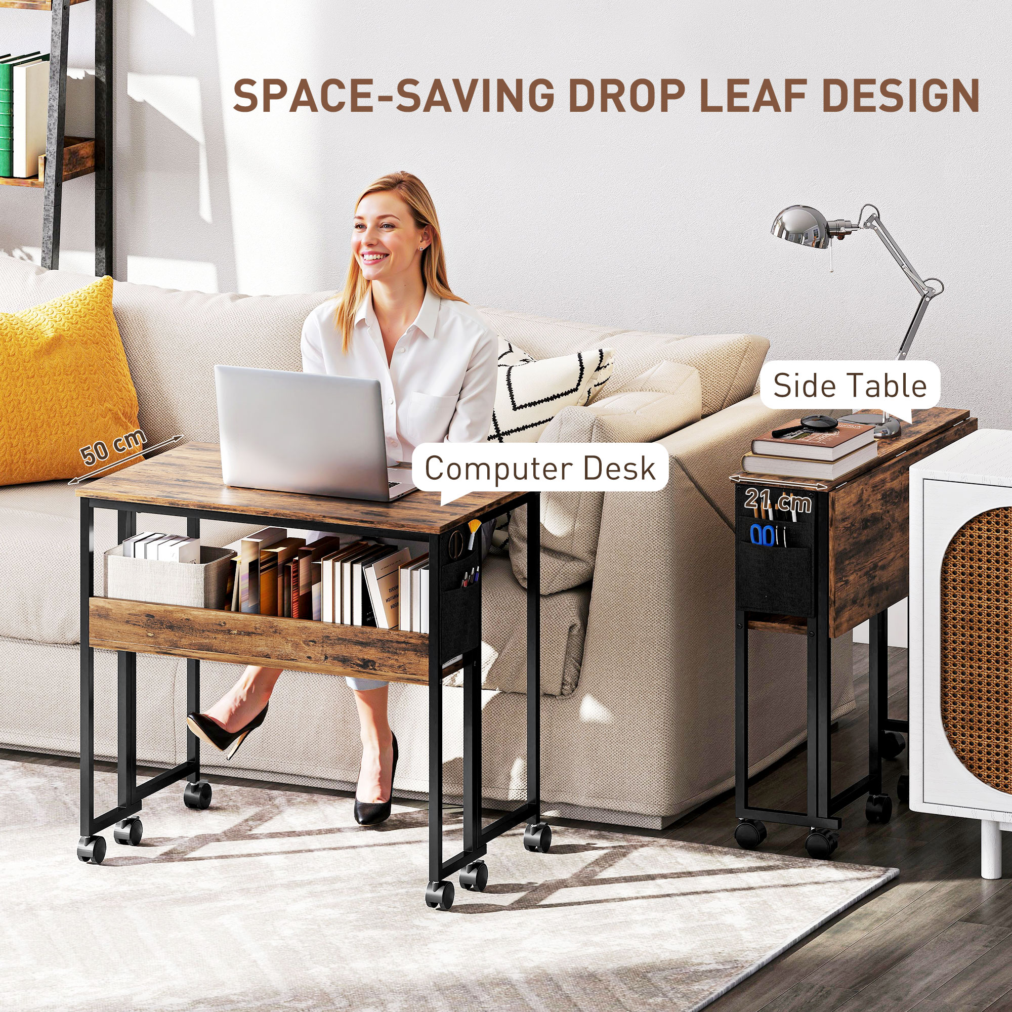 Maximise work space, even in small spaces with this HOMCOM drop leaf computer table. When folded, it is 21 cm and extends to 50 cm - plenty of room for you to work. Features a lower shelf and side bag for close-by holding space for all the essentials. Plus, you can wheel this study desk anywhere with ease, thanks to six 360° swivel casters - complete with four brakes.
