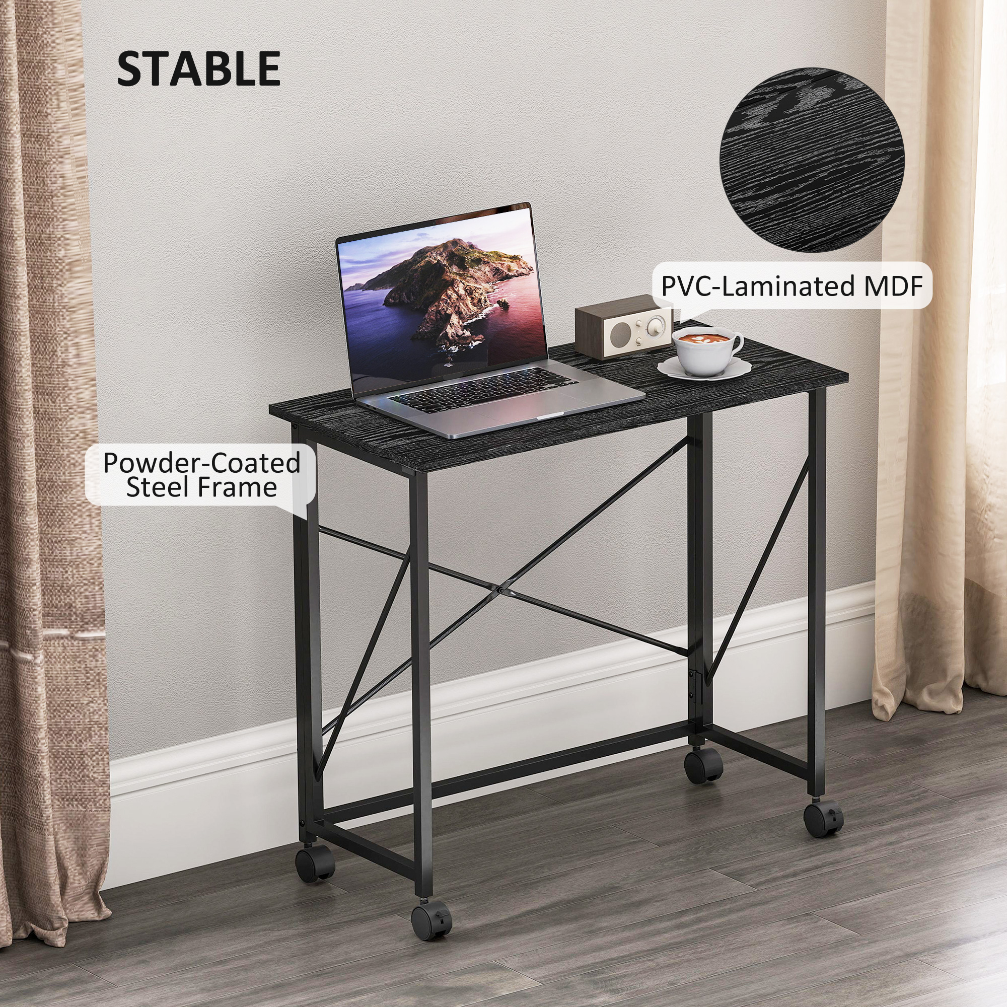 Discover the convenience of the HOMCOM Folding Desk, your new compact companion for every need! This slim, foldable desk tucks away easily behind a door or under furniture, making it a brilliant space-saver. Equipped with four wheels for effortless mobility, two of which have brakes, it's a great choice for your home office, study table, or small computer desk.