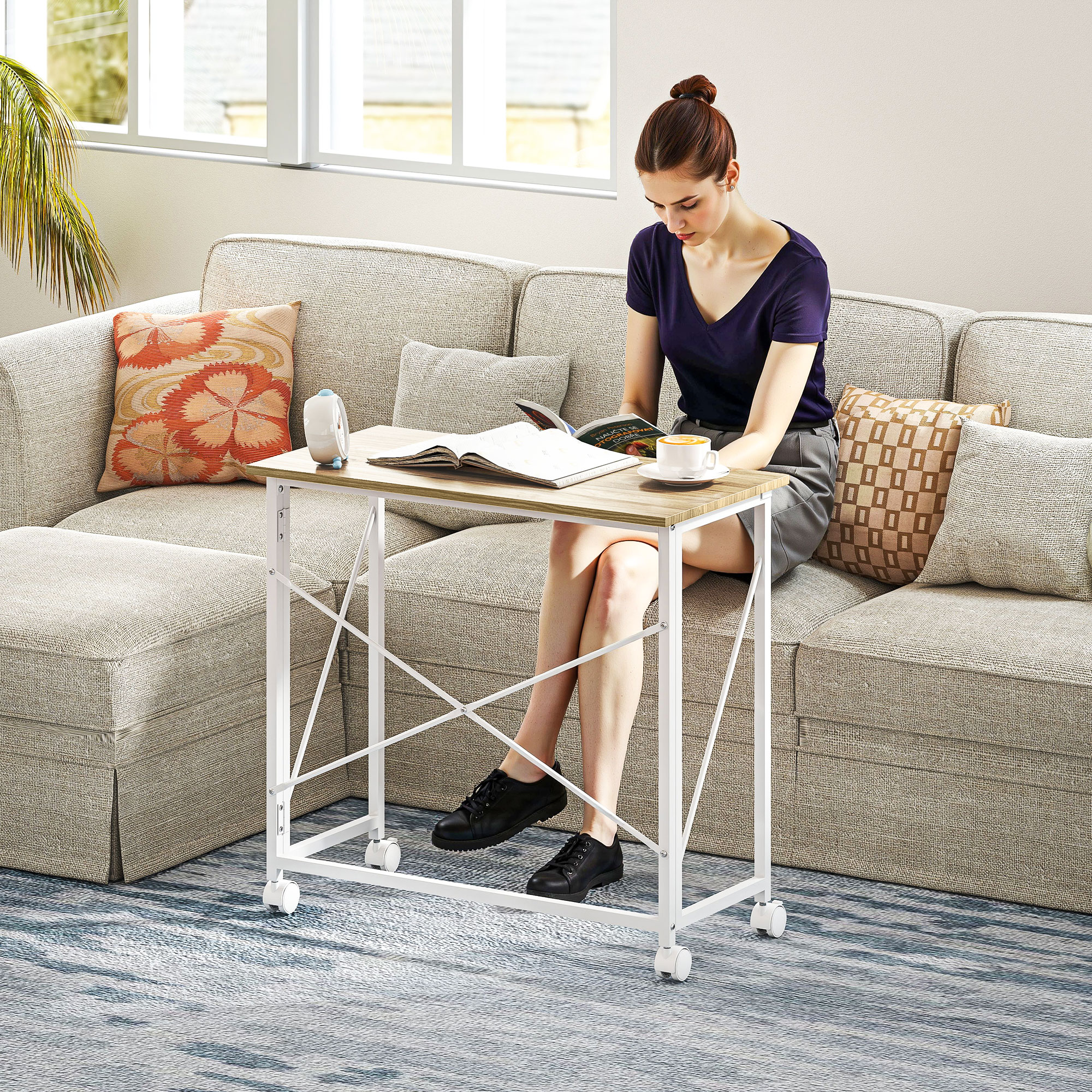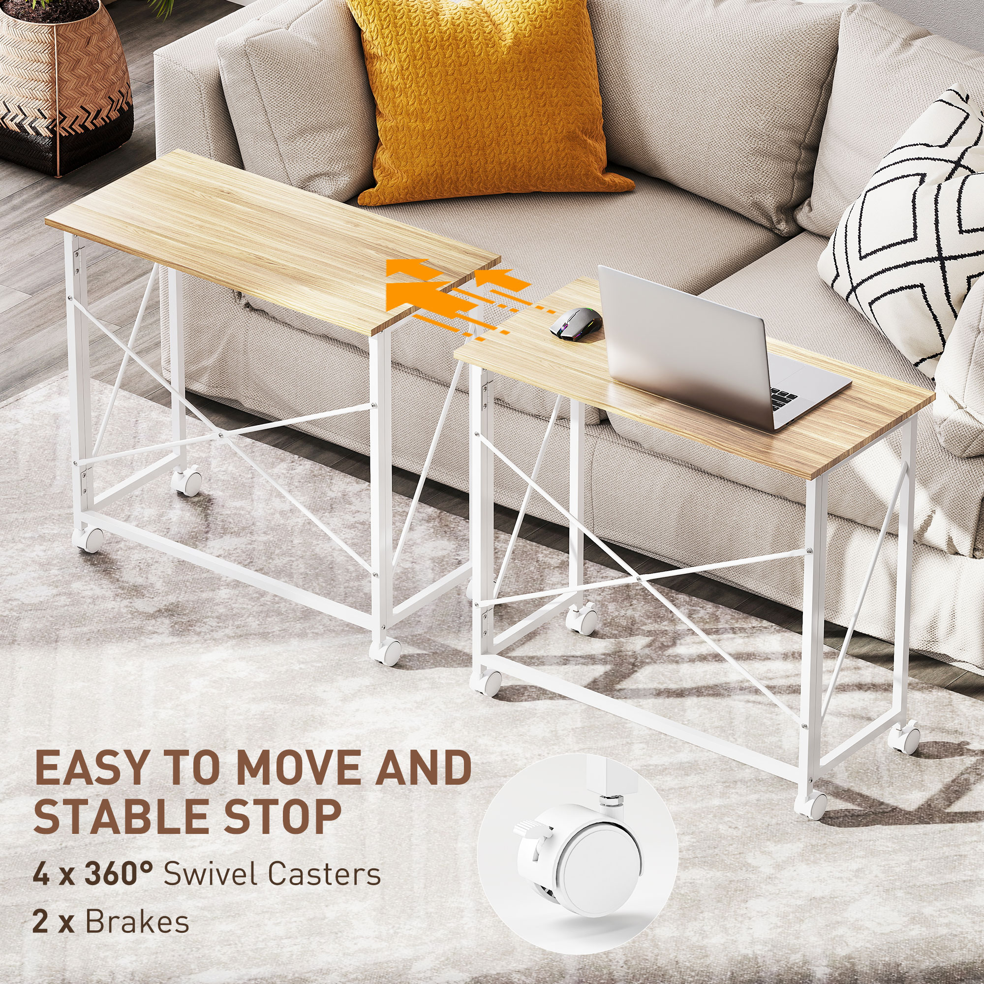 Discover the convenience of the HOMCOM Folding Desk, your new compact companion for every need! This slim, foldable desk tucks away easily behind a door or under furniture, making it a brilliant space-saver. Equipped with four wheels for effortless mobility, two of which have brakes, it's a great choice for your home office, study table, or small computer desk.