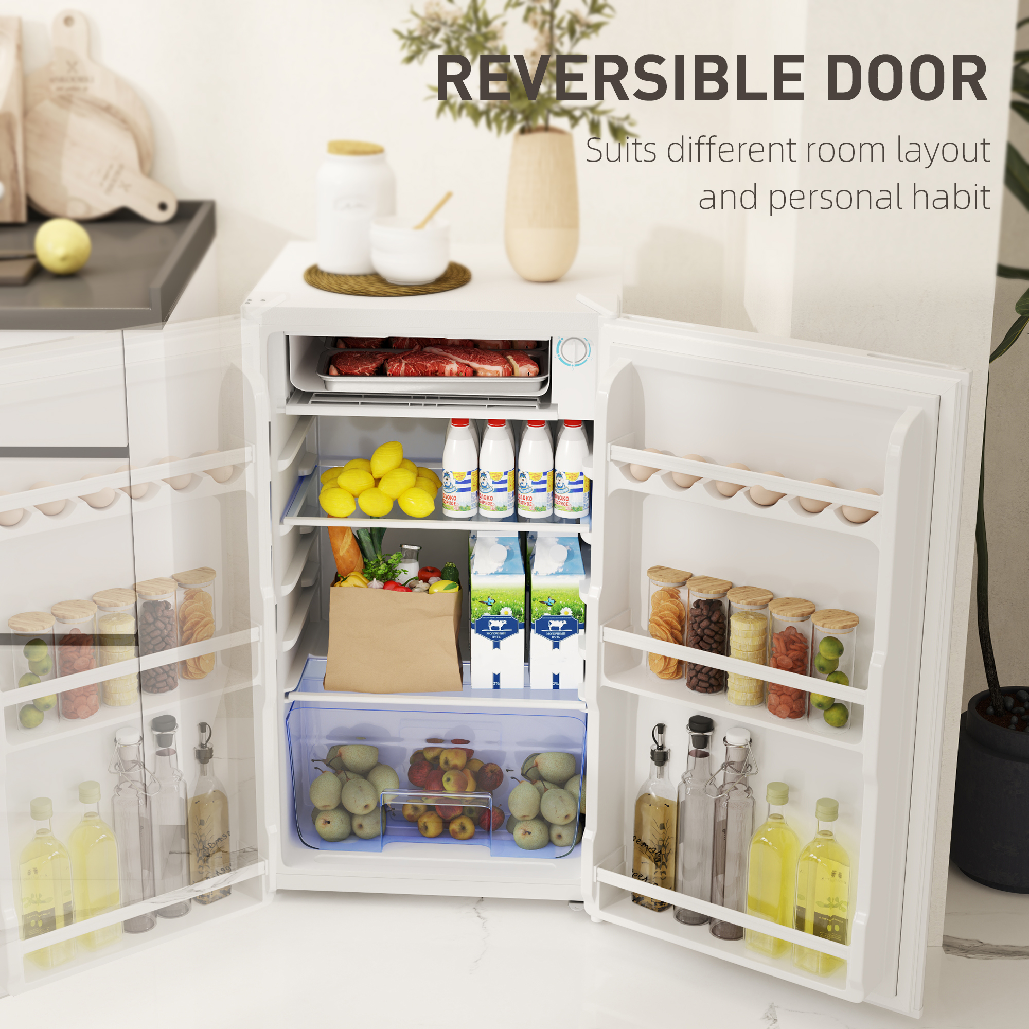 A home and office essential, straight from HOMCOM-this small fridge freezer. The under-counter design makes it great for small spaces, bedrooms and even fitted kitchens. The 91 litre capacity small fridge freezer makes the size suitable for a small family household, shared flat or even for using to yourself. Comes with the standard removable shelves, but with a top chiller box as extra to keep your food and drink deliciously cool and tasty. Temperature range: 0-10℃.