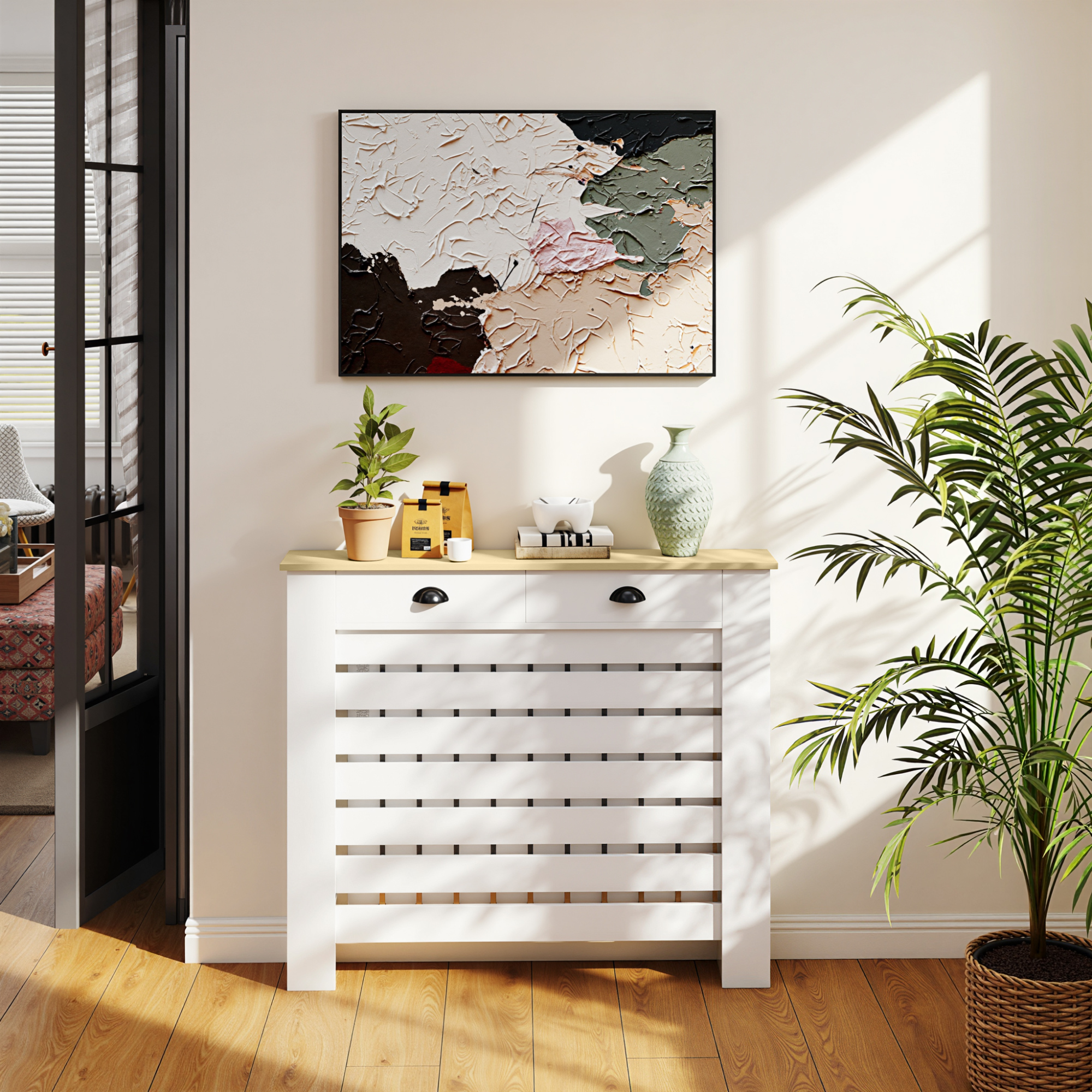 A safe and stylish addition to the home—this HOMCOM slim radiator cover. Made from a robust blend of MDF and particle board, it comes in a slatted design to allow the heat to escape: keeps your space warm and cosy whilst protecting you from directly touching the radiator for safety. Heating cover is complete with a handy top drawer for storage.