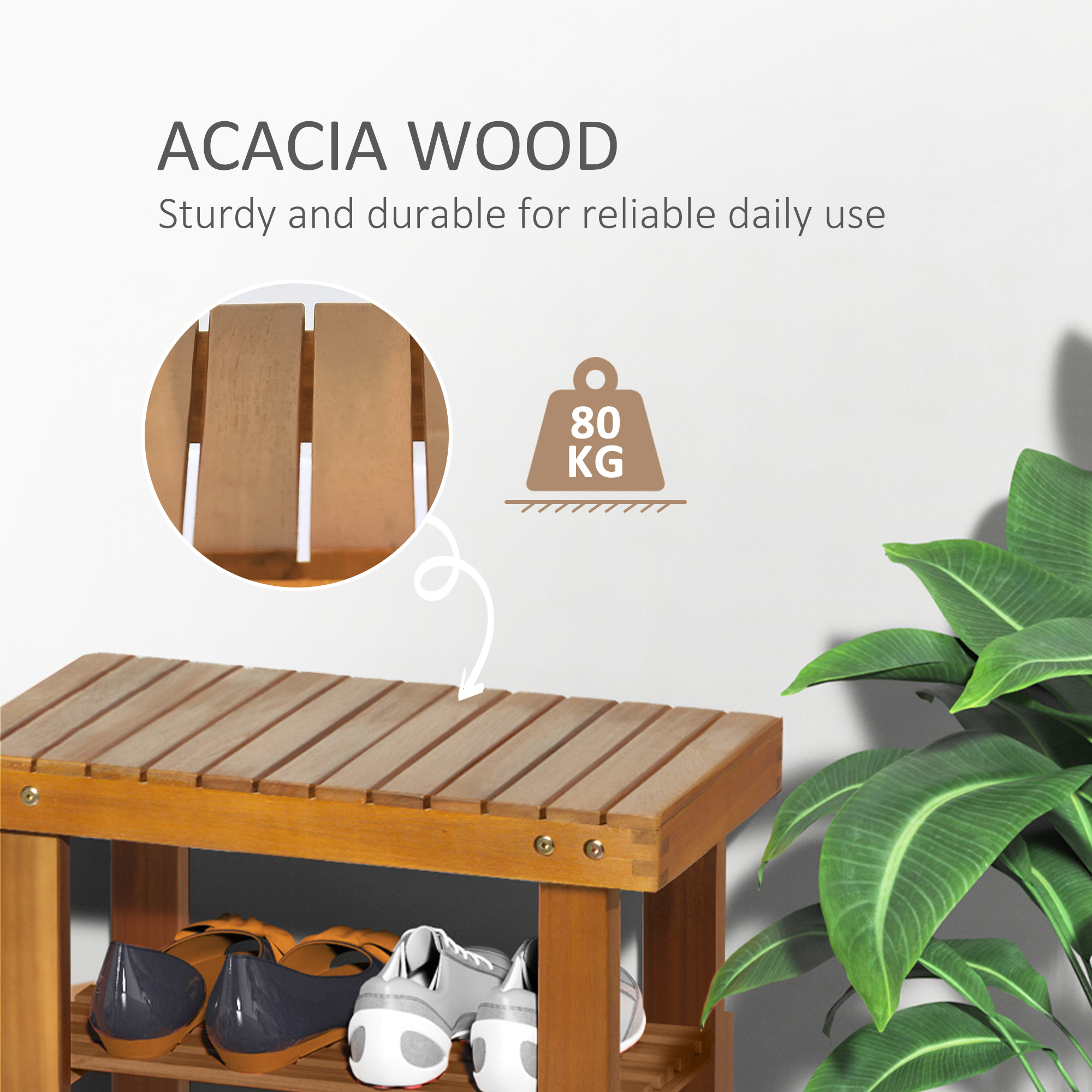 This wooden shoe rack stool by HOMCOM is a great solution to store and organize your footwear. You can store your shoes on the bottom shelves and use the top as a stool seating, which supports up to 80kg of weight thanks to quality acacia wood construction. As a combination of shoe rack and foot stool with vintage style in teak colour, it is designed to be a functional and elegant addition to your bedroom, living room, hallway, corridor and more.