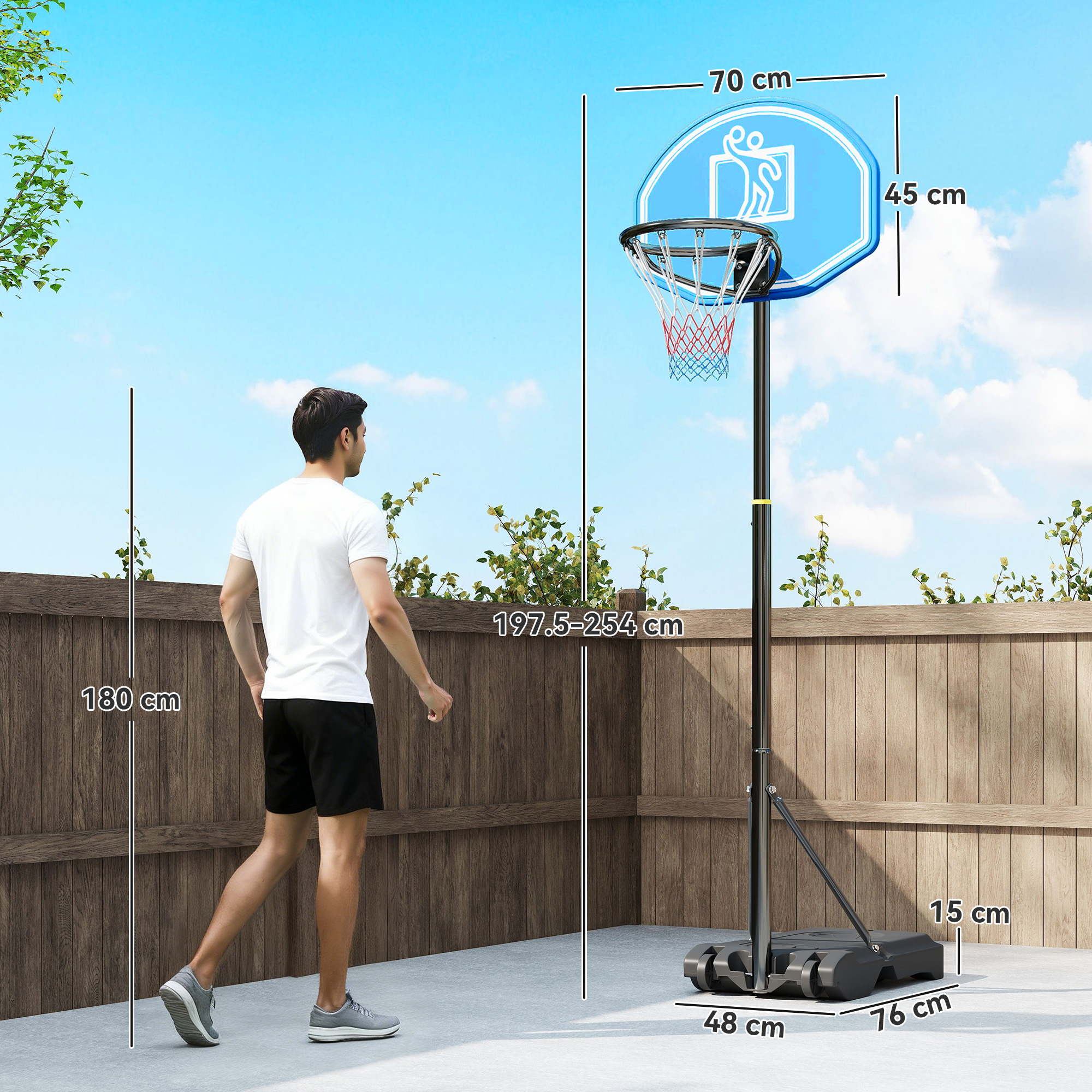 - Backboard: 45H x 2D x 70Wcm. Overall height: 195-245cm. Basketball hoop: 160-210Hcm. Base: 15H x 76L x 48Wcm
