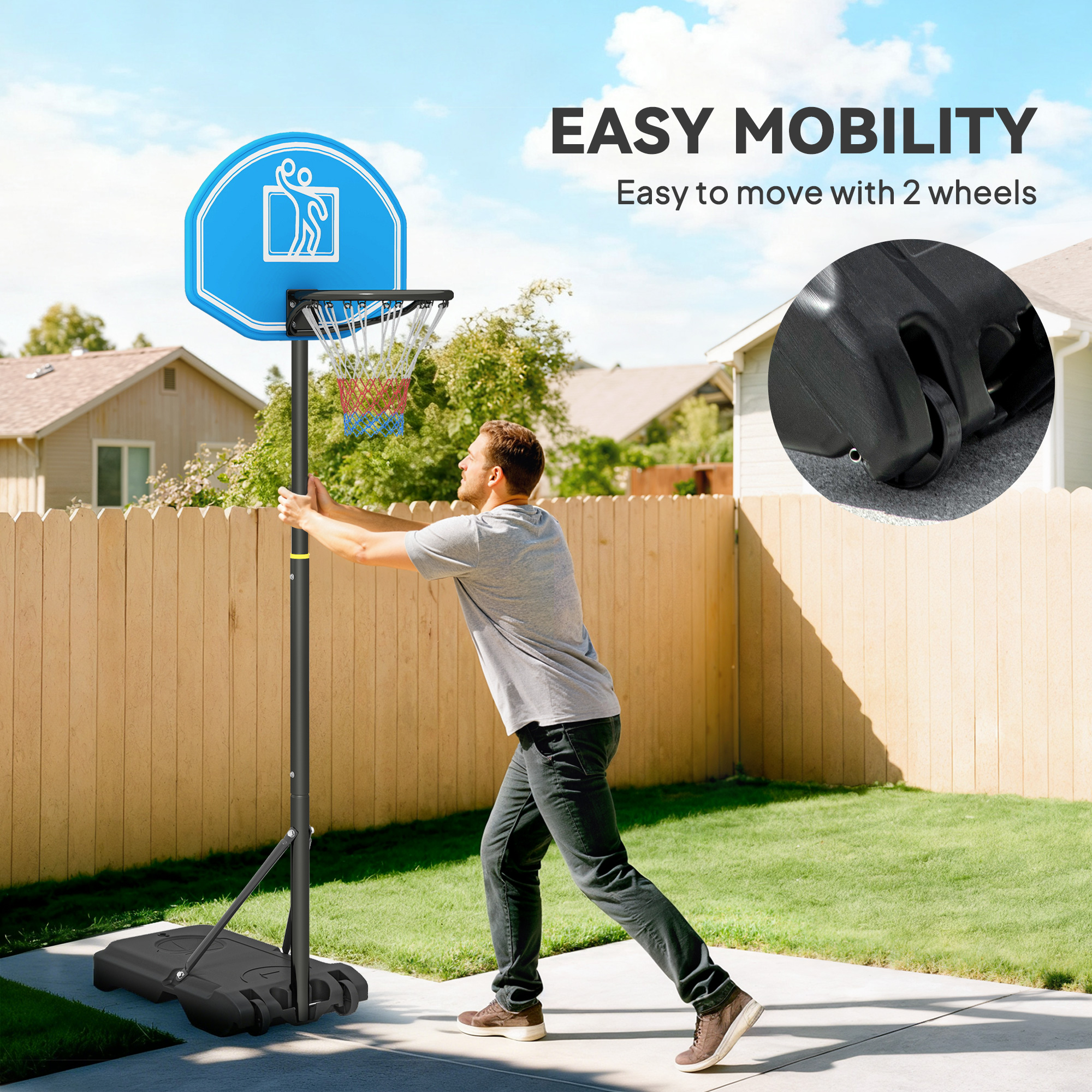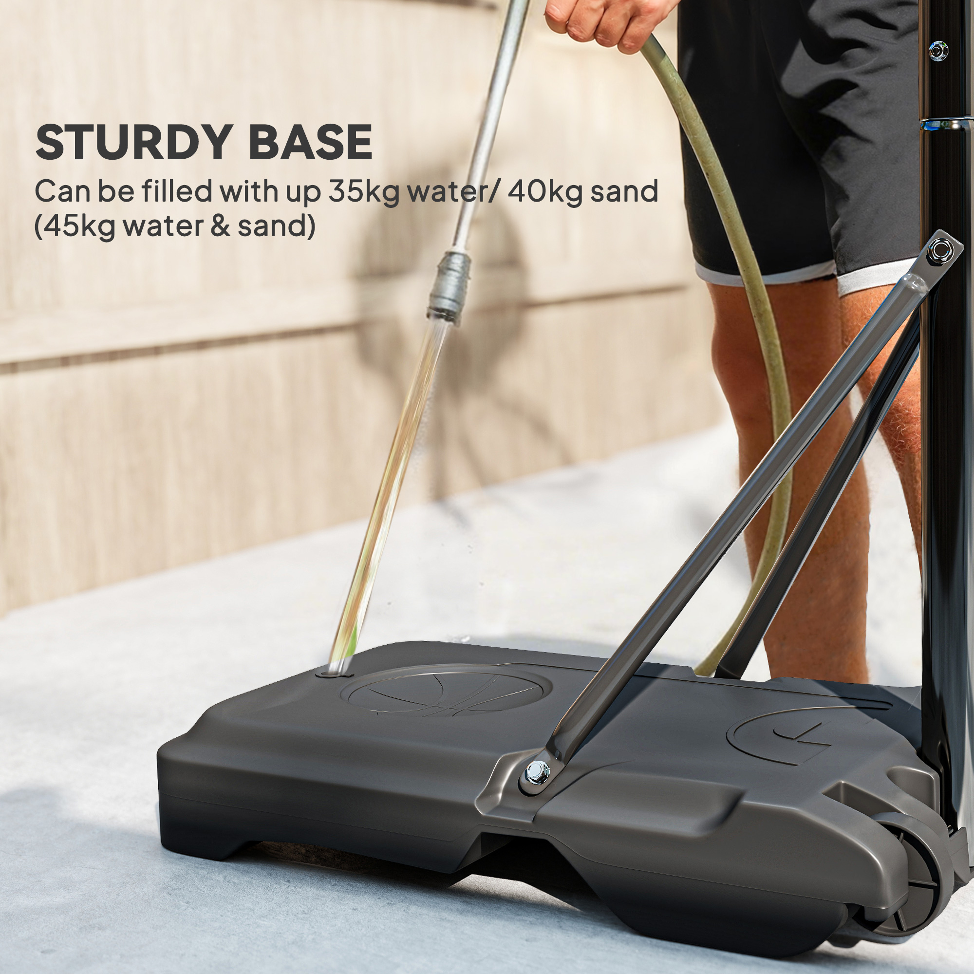 Enjoy shooting hoops with the HOMCOM basketball stand. The solid steel frame is adjustable between 195-245cm, making it suitable for various heights and ages. The hoop is also adjustable between 160-210cm. Fill the large base with water or sand to keep it firmly upright during sessions. It has two wheels at the bottom for easy movement, complete with a ball-holding groove at the back to keep your ball safe and in place when not in use.