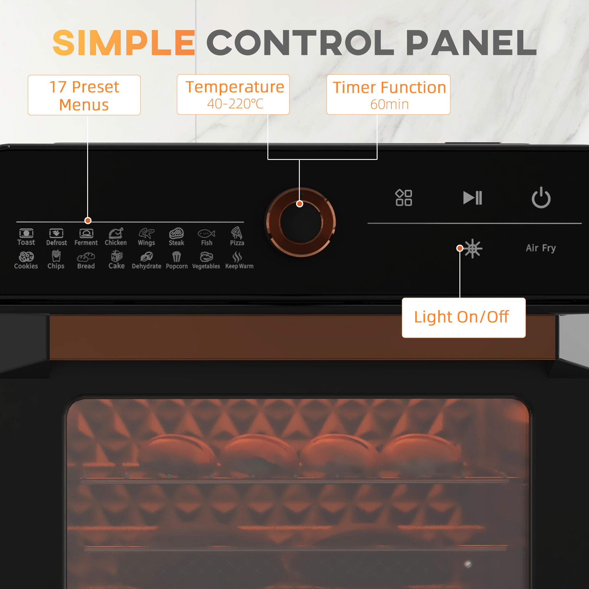 - 20 litre capacity: size cooks 8 slices of toast, an 11" pizza or 8 chicken wings at a time