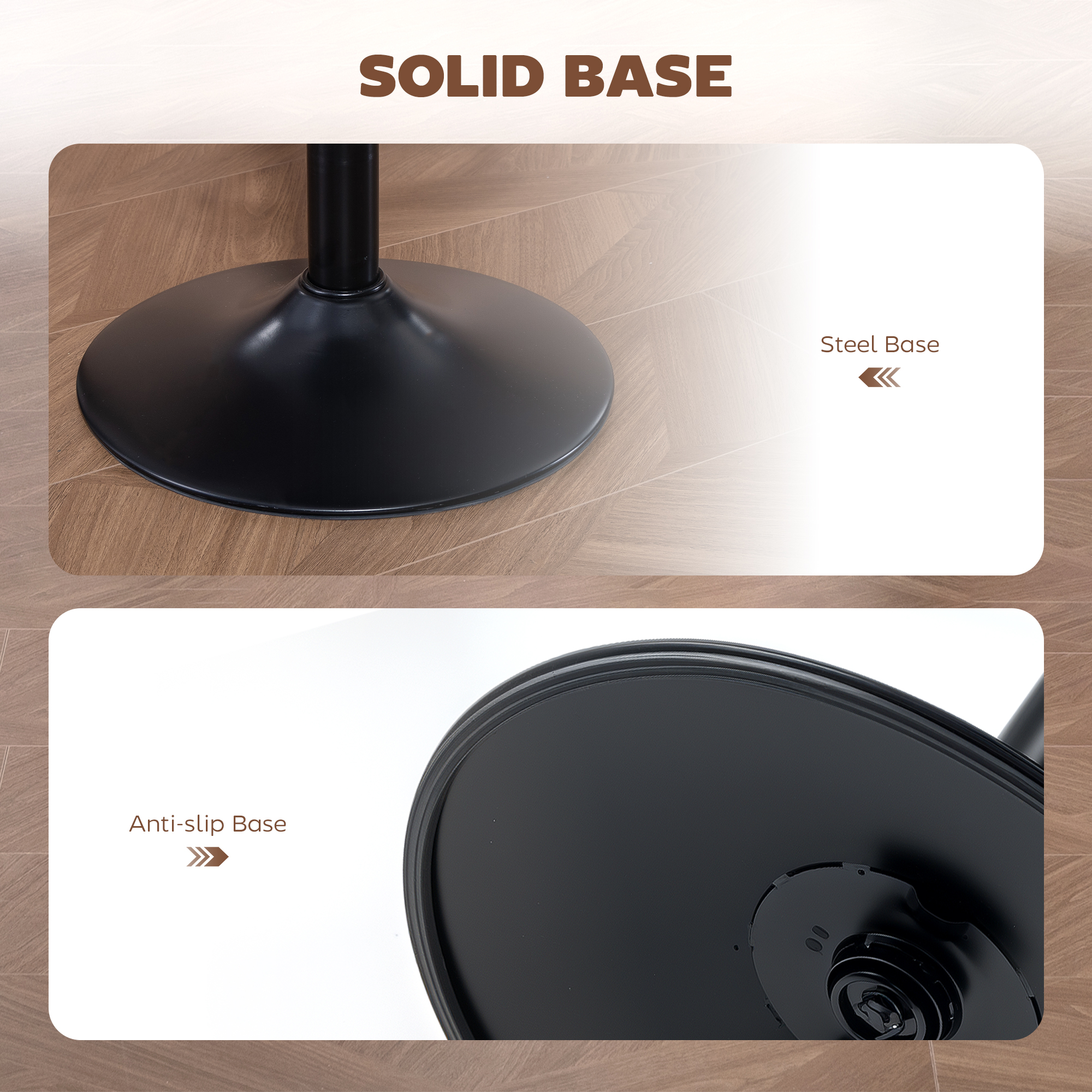 - Steel frame is strong and supportive, with a round base for balance. Non-slip rubber pads light protect the floor
