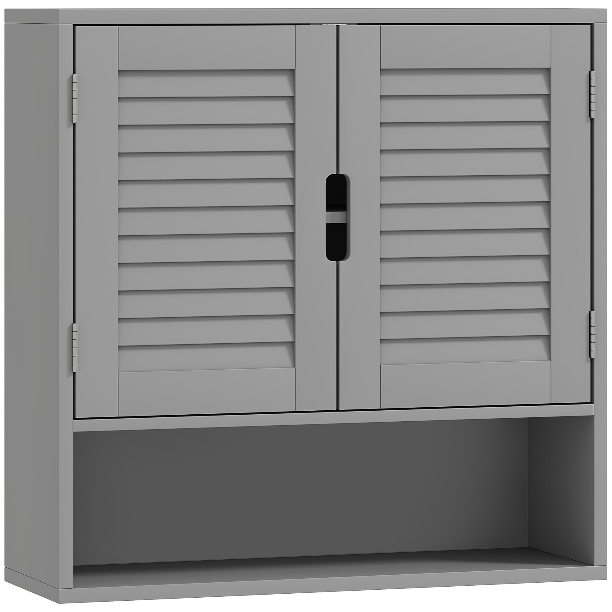 - Stylish grey finish and louvered door elevate your bathroom decor