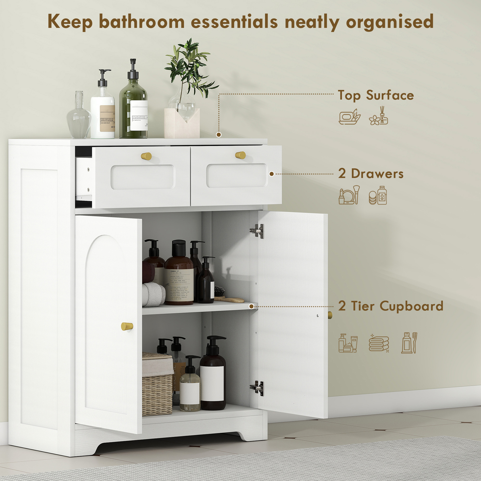Bring calm and order to your bathroom with this stylish floor cabinet from HOMCOM. Whether it's storing spare towels, skincare, or cleaning essentials, the mix of drawers and a roomy cupboard keeps everything tucked neatly away. The adjustable shelf makes it easy to fit taller bottles, while the strong build supports up to 55 kg—great for daily family use. Finished in soft white with arched doors and gold-tone touches, the bathroom storage unit adds a gentle, classic charm to your space.