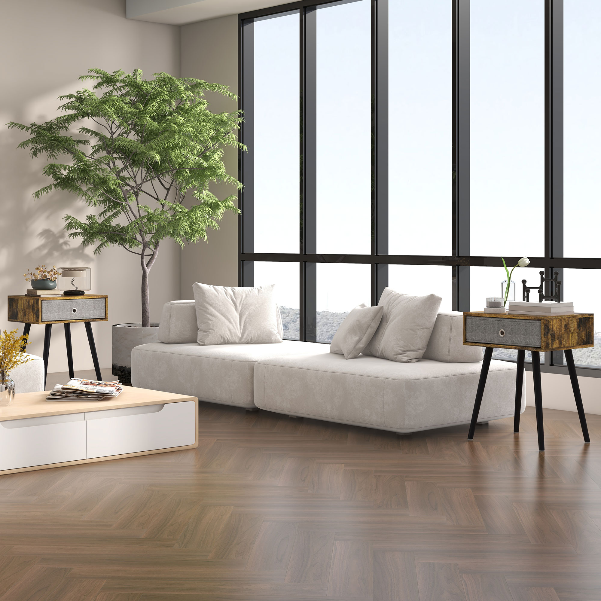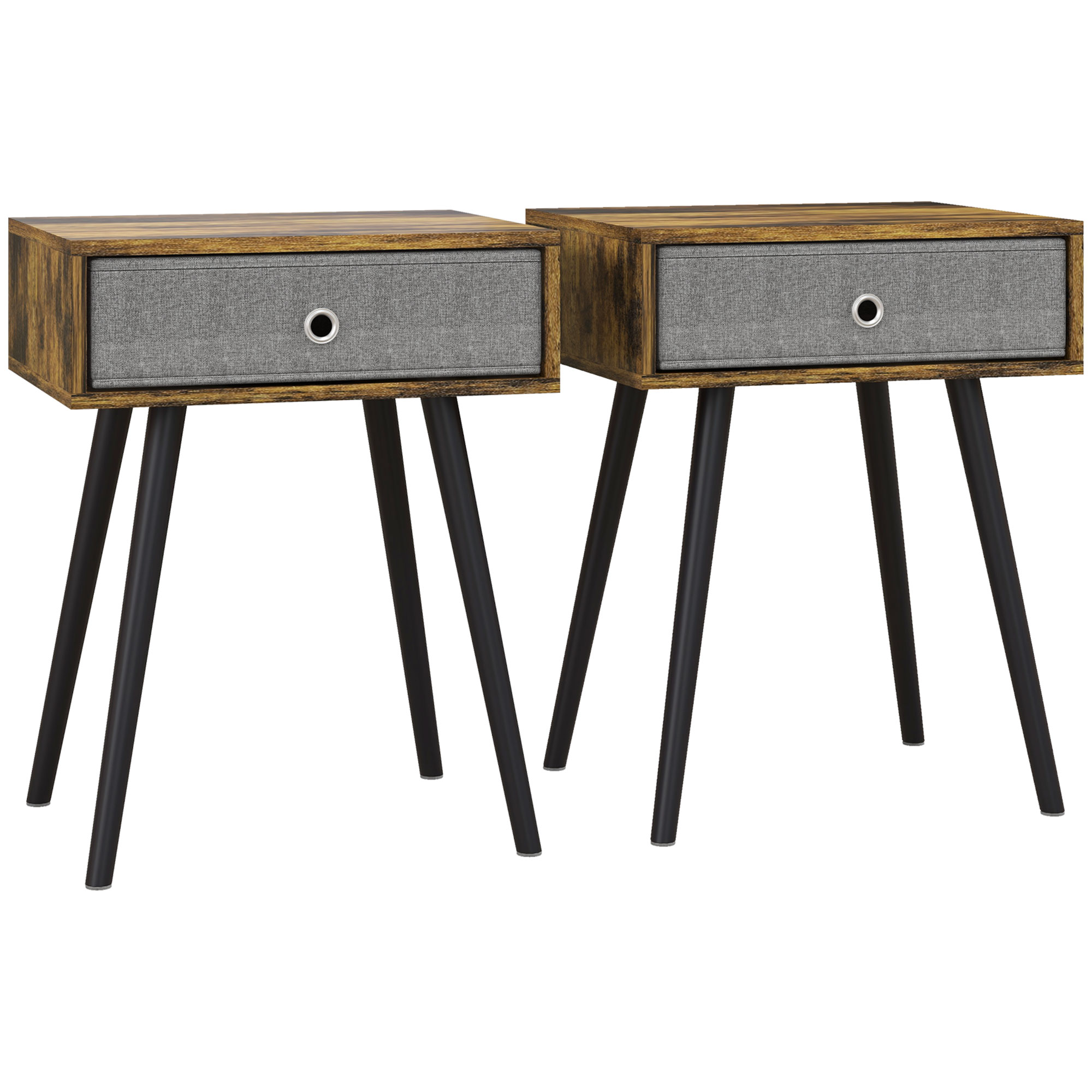 Bring retro storage into the home with this bedside cabinet from HOMCOM. The frame is made from particle board for durability, crafted into a boxy shape in a blotted brown and black effect for a vintage look. The four long wood legs, which are outwardly angled, keep the table balanced. The set of 2 side tables for small spaces come with a fabric drawer for storage, which is easy to pull out and push back in. The drawer can be used to switch up the style and be used as a bedside table.