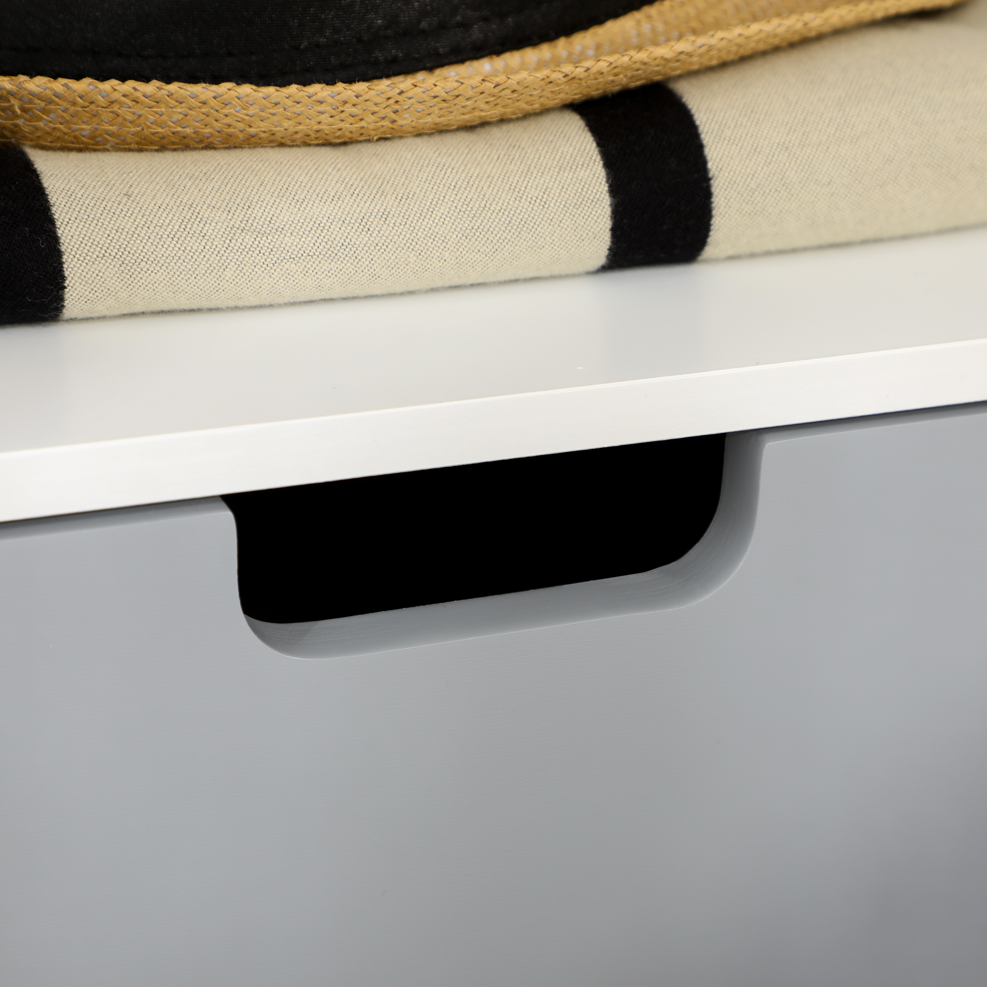 - Features a small open shelf and a grey drawer on the lower half, a sleek top surface