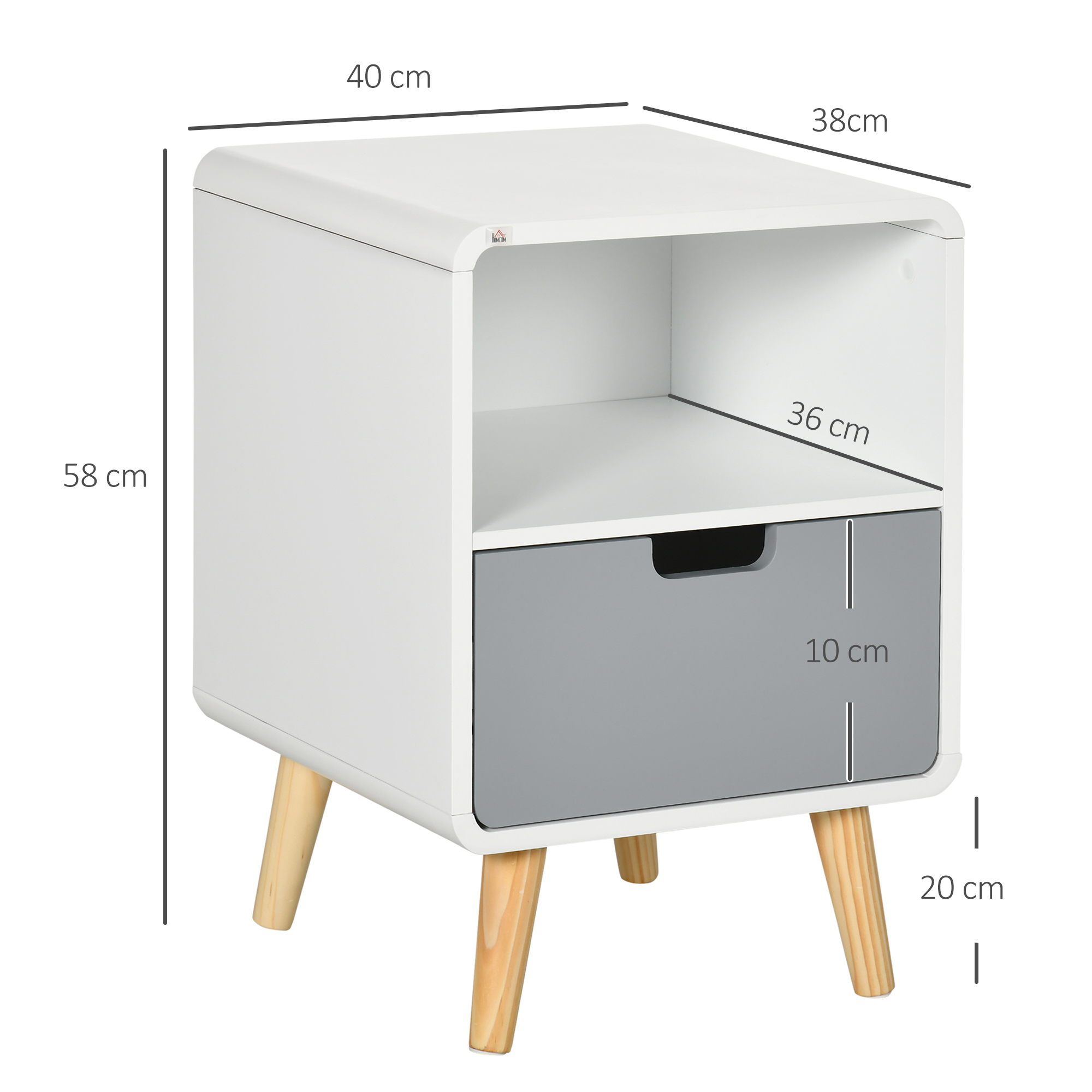 This classic Scandinavian styled living room table from HOMCOM is a perfect addition for your bedroom. Made from pine wood and MDF for long term use. Features a small open shelf and a grey lower drawer, providing sufficient space for your daily essentials. Easy to clean and maintain with painted surface.. This bedside table can be used as a sofa table, night stand, corner table etc. Bring style and functionality to your home with this wooden night stand!