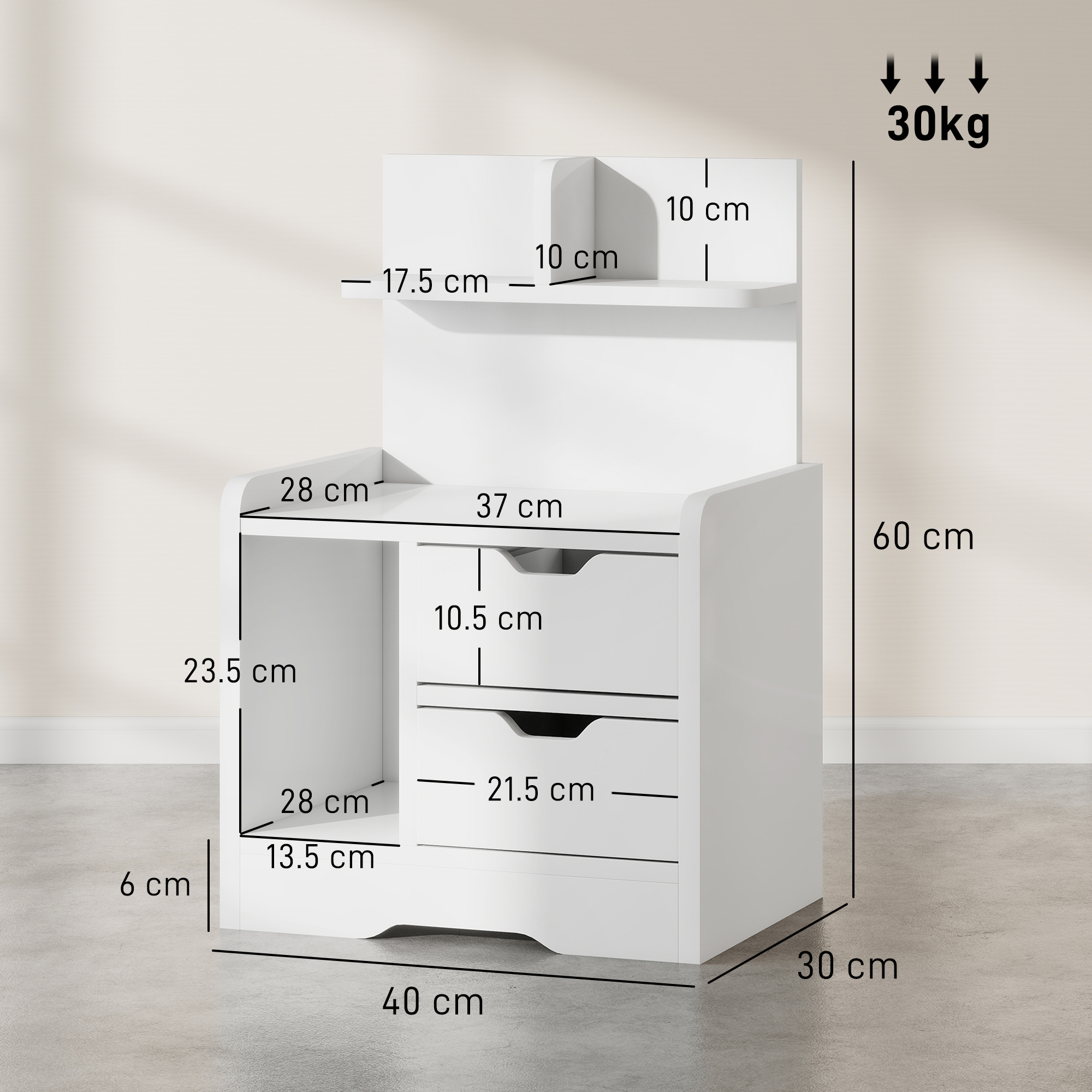 - Weight Capacity: 30 kg (overall), 5 kg (shelf/drawer)